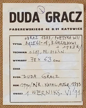 Jerzy Duda Gracz (Częstochowa 1941 - Łagów 2004) - malarz, rysownik, scenograf, pedagog. Dyplom w Akademii Sztuk Pięknych w Krakowie na Wydziale Grafiki w Katowicach otrzymał w 1968. W latach 1976-82 był wykładowcą tej uczelni, następnie profesorem Uniwersytetu Śląskiego w Katowicach. Wykładał również w Europejskiej Akademii Sztuk w Warszawie (1992-2001).