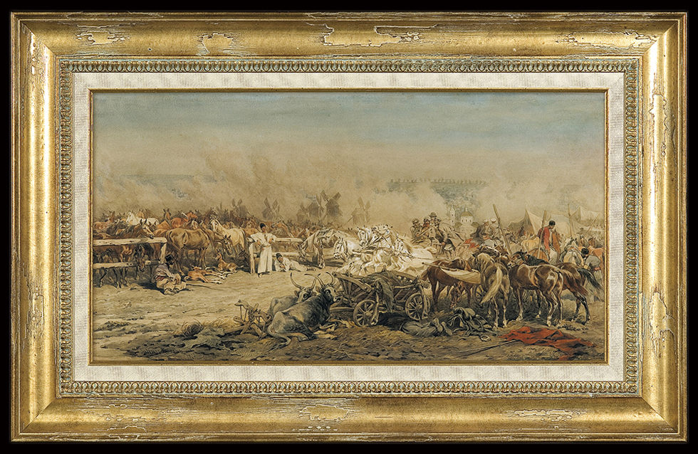 Juliusz Kossak (Wiśnicz 1824 - Kraków 1899) - malarz i ilustrator - był jednym z najpopularniejszych artystów polskich 2. połowy XIX wieku. Naukę rysunku i malarstwa rozpoczął we lwowskiej pracowni Jana Maszkowskiego; później wiele rysował z natury odwiedzając majątki szlacheckie na Ukrainie, Podolu i Wołyniu. W roku 1852 był w Wiedniu, na Węgrzech i w Petersburgu, a następnie zamieszkał na stałe w Warszawie. Lata 1856-1860 spędził w Paryżu, gdzie przyjaźnił się z Horacem Vernetem. Powróciwszy do Warszawy w latach 1862-1868 był kierownikiem artystycznym „Tygodnika Ilustrowanego”. W roku 1869 przeniósł się na stałe do Krakowa, skąd wyjeżdżał jeszcze do Monachium, by malować w atelier batalisty Franza Adama. Kossak był przede wszystkim znakomitym akwarelistą; rzadziej posługiwał się techniką olejną. Malował obrazy historyczne i batalistyczne, sceny rodzajowe ilustrujące życie i tradycje dworu szlacheckiego oraz obyczaje polskiego ludu. Ale prawdziwymi bohaterami jego obrazów były konie, których ruch, temperament, charakter i indywidualność potrafił po mistrzowsku przedstawić. Był także autorem wielu ilustracji do czasopism i książek, trafiającym bezbłędnie tak w klimat utworów literackich, jak i w tęsknoty i potrzeby odbiorców - czytelników Pieśni o ziemi naszej Wincentego Pola, Trylogii Henryka Sienkiewicza, Pana Tadeusza i poematów Adama Mickiewicza.