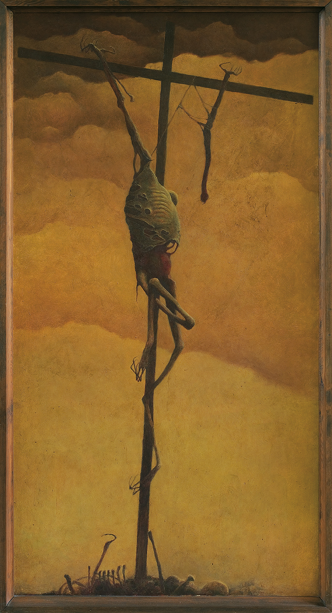 Zdzisław Beksiński (Sanok 24 II 1929 - Warszawa 21 II 2005) studiował w latach 1947-1952 na Wydziale Architektury Politechniki Krakowskiej. Był artystą samoukiem, który osiągnął niekwestionowaną pozycję w polskiej sztuce współczesnej, potwierdzoną obecnością jego prac na prestiżowych wystawach i w kolekcjach muzealnych. Początkowo zajmował się fotografią, którą interesował się od lat studenckich, po 1956 zyskując uznanie jako twórca fotogramów o estetyce opartej o efekty fakturowe. W latach 1958-1962 tworzył abstrakcyjne obrazy-reliefy o bogatej fakturze, głównie metalowe, będące odmianą malarstwa materii. Pod koniec tego okresu powstawały ażurowe formy o kształtach figur i pełnoplastyczne rzeźby w metalu. Kolejnym etapem jego twórczości były lata 1962-1974, kiedy poświęcał się głównie rysunkowi. W latach 60. rysował piórkiem i tuszem figuralne kompozycje odznaczające się karykaturalną deformacją postaci. Od końca lat 60. tworzył rysunki węglem i kredkami, będące monochromatyczną odmianą jego równoległej twórczości malarskiej. Od 1974 zajmował się niemal niepodzielnie malarstwem. Jego charakterystyczny styl bazował na perfekcji technicznej, której towarzyszyła niezwykłość wizji. Malował świat po katastrofie, naznaczony piętnem śmierci i rozpadu. Jego obrazy zaludniają postaci i stwory o ludzkich wprawdzie bądź zwierzęcych kształtach, lecz o cechach fantomów, automatów lub rozpadających się trucheł. Artysta nie nadawał swym obrazom i rysunkom tytułów (poza porządkującymi symbolami), akcentując w ten sposób swój brak zainteresowania dla literackiej strony przedstawień. Sam mówił, że malując całkowicie poddaje się wizji, „fotografuje“ ją. W ostatnich latach włączył do swego warsztatu artystycznego elektroniczne techniki generowania obrazu, które wykorzystywał do tworzenia komputerowych fotomontaży. Sztuka Beksińskiego, wielokrotnie wystawiana i omawiana, budzi skrajne emocje wśród znawców i publiczności.