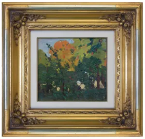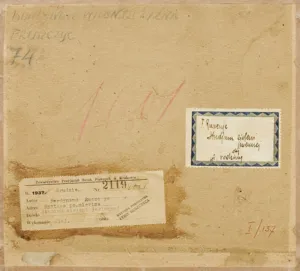 – nalepka z niebieską ramką-obwódką i rękopiśmiennym tekstem: F. Ruszczyc | Studjum zieleni | jesiennej | olej | wł. rodziny.;