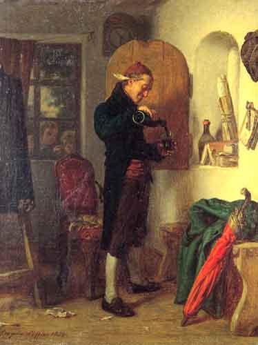 Leopold Löffler (Loeffler) - malarz scen rodzajowych i rodzajowo-historycznych; pierwotnie studiował na wydziale filozoficznym Uniwersytetu we Lwowie. Jednocześnie uczył się malarstwa, które następnie studiował w Akademii wiedeńskiej u Ferdinanda Georga Waldmüllera (1845-1846), później w Paryżu (od 1851 lub 1852) i w Monachium (1856). Na stałe zamieszkał w Wiedniu, gdzie cieszył się uznaniem i został mianowany członkiem tamtejszej Akademii Sztuk Pięknych. Związany ze środowiskiem polskich malarzy kształcących się w wiedeńskiej Akademii, przyjaźnił się, m.in. z Arturem Grottgerem, Franciszkiem Tepą i Juliuszem Kossakiem. Często przyjeżdżał do kraju - do Lwowa, Radymna i do Krakowa, dokąd z czasem przeniósł się na stałe. W latach 1877-1897 był profesorem krakowskiej Szkoły Sztuk Pięknych; do grona jego uczniów należeli, m.in. Zdzisław Jasiński, Wojciech Weiss, Wincenty Wodzinowski, Stanisław Wyspiański. Malował obrazy historyczno-rodzajowe (Śmierć Stefana Czarnieckiego, 1860, Powrót rodziny szlacheckiej na gruzy rodzinnego domu po napadzie Tatarów, 1858), portrety oraz rodzajowe scenki mieszczańskie i wiejskie, powstające pod wyraźnym wpływem malarstwa Waldmüllera. Czytelna anegdota i sentymentalny wdzięk, doskonały rysunek i niezwykła precyzja w oddawaniu szczegółów przyniosły tym pracom ogromną popularność w kraju, w Austrii i na Węgrzech. Powodzenie sprawiło, że artysta - czasem nawet wielokrotnie - powtarzał te same kompozycje w licznych replikach. Jego obrazy pokazywane były na różnych wystawach; przede wszystkim w wiedeńskim Künstlerhaus, ale także w Berlinie, Monachium, Paryżu, Kolonii, Pradze oraz w Krakowie, Warszawie, Pownaniu i we Lwowie. Kupowano je do zbiorów cesarza, arystokracji, do licznych kolekcji niemieckich i prywatnych. Powielane w reprodukcjach „rozchodziły się po całej monarchii“. Dla podkreślenia swojej narodowości od roku 1867 artysta często dodawał przy sygnaturze słowo „Radymno“, nazwę miejscowości gdzie spędził dzieciństwo.