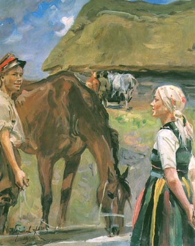 Wojciech Kossak (Paryż 1856 - Kraków 1942 ) – powszechnie znany malarz, postrzegany przede wszystkim jako świetny batalista. Syn i uczeń Juliusza Kossaka kształcił się w krakowskiej Szkole Sztuk Pięknych, w Akademii monachijskiej oraz w Paryżu. W latach 1895-1902 przebywał głównie w Berlinie, pracując dla cesarza Wilhelma II. Wiele podróżował, m.in. do Hiszpanii i Egiptu, gdzie wykonywał szkice do zamierzonych panoram. W późniejszych latach kilkakrotnie wyjeżdżał do Stanów Zjednoczonych wykonując zamówienia portretowe. W 1913 był mianowany profesorem warszawskiej Szkoły Sztuk Pięknych. W latach I wojny światowej pełnił służbę wojskową. Był współautorem panoram: „Racławice” (1893-1894), „Berezyna” (1895-1896), „Bitwa pod piramidami” (1901) oraz szkiców do niezrealizowanej „Somosierry” (1900). Z temperamentem i swobodą tworzył szeroko malowane, dynamiczne sceny batalistyczne, historyczne, rodzajowe oraz liczne portrety. Z upodobaniem malował konie. Jego obrazy, gloryfikujące dawne i współczesne artyście polskie wojsko i bohaterstwo żołnierzy, trafiały do patriotycznych uczuć odbiorców i cieszyły się ogromna popularnością.