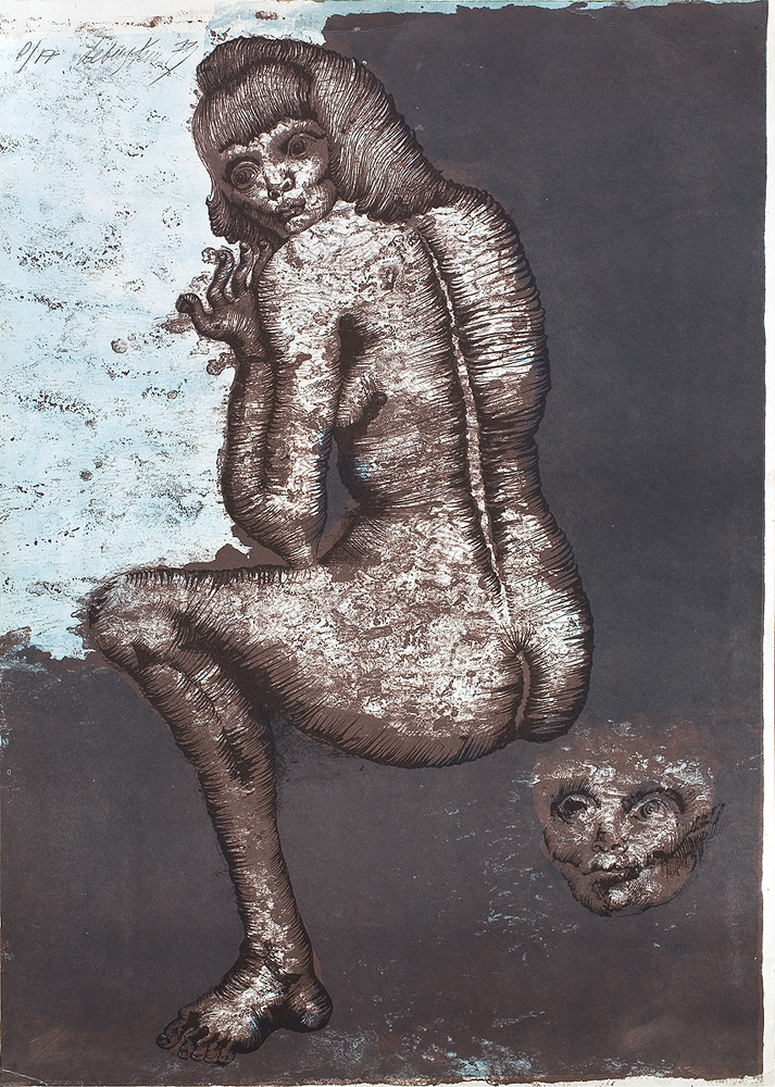 Jan Lebenstein (Brześć Litewski 1930 - Kraków 1999) w latach 1948-1954 studiował malarstwo w ASP w Warszawie pod kierunkiem prof. Eugeniusza Eibischa i Artura Nachta-Samborskiego. W 1955 wziął udział w wystawie w warszawskim Arsenale. Zaprzyjaźniony w czasie studiów z Mironem Białoszewskim, swą pierwszą wystawę indywidualną pokazał w 1956 w Teatrze na Tarczyńskiej. W 1959 zdobył Grand Prix de la Ville de Paris na I Biennale Młodych w Paryżu i w tym roku przeniósł się na stałe do Paryża. Po seriach "figur kreślonych" (na papierze milimetrowym) i "figur hieratycznych" z lat 1955-1958 maluje cykl "figur osiowych" (1958-1962), które wystawia w Paryżu i USA. Równolegle w 1960 zaczyna rysowane "karnety", rodzaj dziennika, który w przyszłości dostarczy motywów wykorzystanych w obrazach. W latach 1964-1965 maluje "Bestiarium", cykl fakturowych, archaizowanych stworów przypominających prehistoryczne wykopaliska. Bezpośrednio po nich wprowadza do swych obrazów postaci ludzkie i fantastyczne, odgrywające sceny ni to mitologiczne, ni to ze snu, często przesycone erotyką. W 1970 projektuje witraże dla Centre du Dialogue w Paryżu. W W 1971 otrzymuje obywatelstwo francuskie 1974 powstają gwasze inspirowane Folwarkiem zwierzęcym George'a Orwella. W latach 1976-1989 tworzy wyłącznie w technice gwaszu i pastelu, podejmując tematykę mitologiczną i zaczerpniętą z Biblii: cykle ilustracji do Księgi Hioba (wyd. 1979) i do Apokalipsy (wyd. 1986) w nowych przekładach Czesława Miłosza. W 1989 powraca do malarstwa olejnego (cykl "Pergamon"). Artysta otrzymał m. in. nagrodę Fundacji im. Alfreda Jurzykowskiego w 1976, Nagrodę Muzeum Archidiecezji Warszawskiej w 1985, Nagrodę im. Jana Cybisa w 1987.