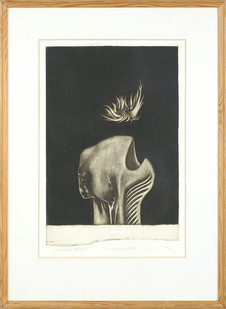 Mieczysław Majewski (Włocławek 12 I 1915 - Warszawa 25 II 1988) studiował w ASP w Warszawie w latach 1935-1939, dyplom uzyskał w 1947. Był członkiem grup artystycznych "Warszawa" i "Kardasz" (1957-1963). Zajmował się równolegle malarstwem i grafiką warsztatową, przeważnie w technikach metalowych. Wykonywał też prace z dziedziny grafiki użytkowej (ilustracje książkowe). Od 1946 brał udział w wystawach zbiorowych w kraju i za granicą. W latach 1962-1973 miał trzy wystawy indywidualne w kraju i trzy za granicą (Wiedeń, Praga, Sofia). Zdobył liczne nagrody, m. in. wyróżnienie na III Ogólnopolskiej Wystawie Plastyki, Warszawa 1952, brązowy medal na Międzynarodowej Wystawie Grafiki "Gruppo Artistes Sardes", Iglesias 1962, nagrody na I-III Festiwalu Sztuk Pięknych, Warszawa 1966, 1968, 1970 (kolejno: brązowy medal, złoty medal, wyróżnienie), nagrodę w konkursie Najlepsza Grafika Roku 1971. Był też laureatem nagród Ministra Kultury i Sztuki w 1961 i 1964 oraz nagrody II stopnia Ministra Obrony Narodowej w 1968.