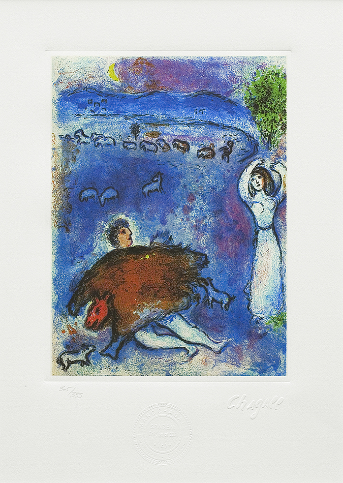 Marc Chagall uczył się rysunku u witebskiego malarza nazwiskiem Juda Pen, następnie od 1907 studiował w Akademii petersburskiej. W 1910 wyjechał na stypendium do Paryża. Zamieszkał w La Ruche na Montparnassie, wszedł do kręgu artystów, wśród których byli m.in. Modigliani, Soutine, Delaunay. W 1914 wrócił do Witebska, w 1915 poślubił Bellę (zm. 1944), muzę i bohaterkę wielu obrazów. W latach 1915-1917 mieszkał w Sankt Petersburgu, gdzie zastała go rewolucja. Mianowany komisarzem sztuk pięknych na obszar Witebska, założył tam i prowadził w latach 1918-1919 szkołę artystyczną, której profesorami byli m.in. Kazimierz Malewicz i El Lissitzky. W 1919 przeniósł się do Moskwy, gdzie do 1922 był kierownikiem artystycznym Państwowego Teatru Żydowskiego. W 1923 ostatecznie opuścił Rosję, osiedlając się w Paryżu. We Francji spędził resztę życia, z przerwą w latach 1941-1947, kiedy to schronił się w Nowym Jorku. Jego styl, wykształcony w młodości niezależnie od równoległych kierunków w sztuce, pozostał w ciągu życia artysty mało zmieniony. Wyobraźnia i sposób obrazowania Chagalla, zbliżone do sztuki naiwnej, wpisały się najsilniej w nurt surrealizmu, stając się jego znaczącym rozszerzeniem. Chagall łączył poetyckość i cudowność swych fantazji z rozwiniętym warsztatem malarza-kolorysty. Był też utalentowanym i płodnym grafikiem (cykle ilustracji do "Martwych dusz" Gogola, 1923-1927, "Bajek" La Fontaine’a, 1927-1930, Biblii, 1931-1955 – każdy cykl liczył ponad 100 plansz w technikach metalowych). Zajmował się scenografią (projekty dla Metropolitan Opera w Nowym Jorku, 1945, Opery w Paryżu, 1958), malarstwem monumentalnym (plafon w Operze paryskiej, 1963-1964), projektował witraże, dekoracje ceramiczne.