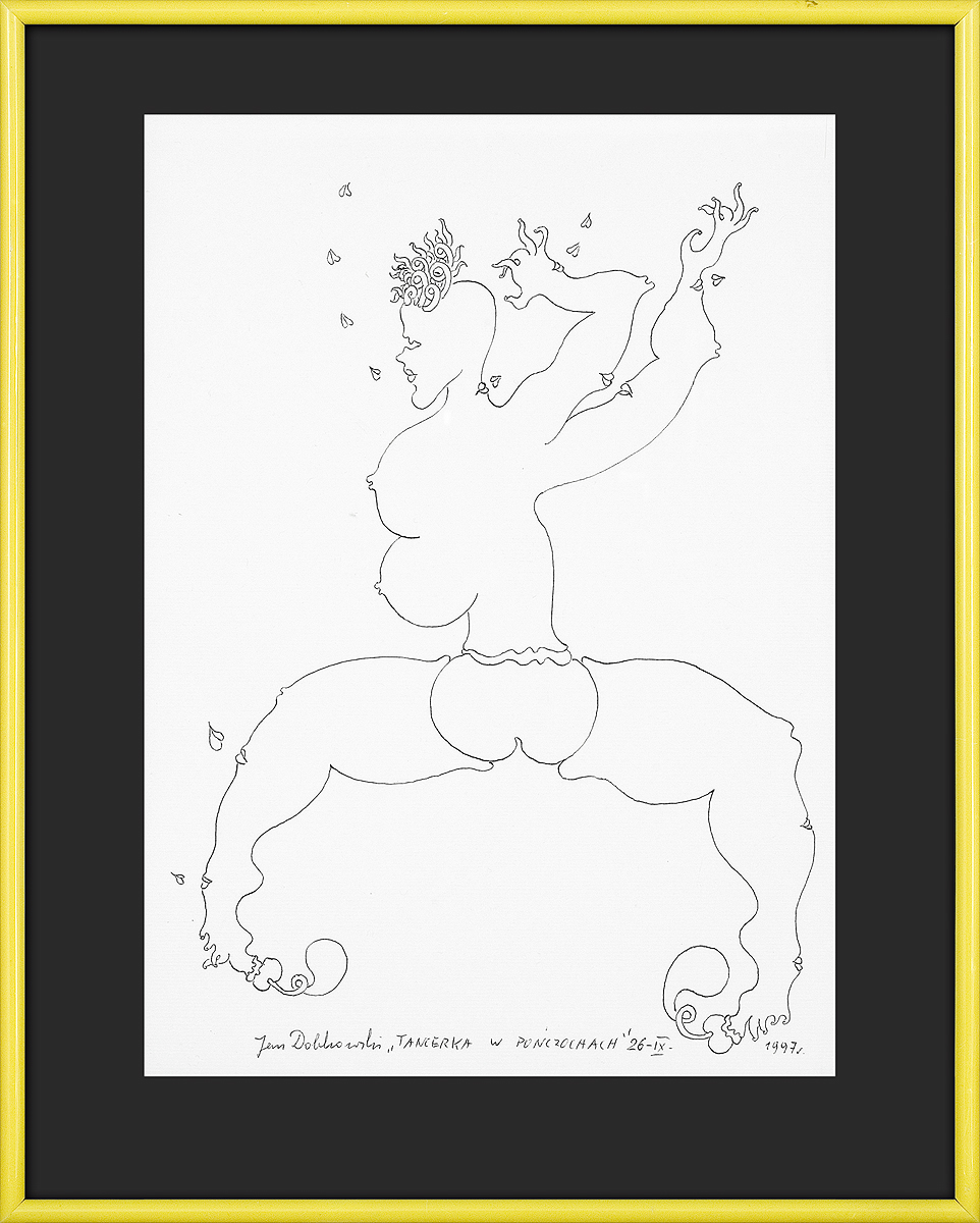 Jan Dobkowski (Łomża 1942, mieszka w Warszawie) studiował w latach 1962-1968 na Wydziale Malarstwa warszawskiej ASP pod kierunkiem prof. Juliusza Studnickiego i Jana Cybisa. Będąc jeszcze na studiach, w 1966, utworzył duet artystyczny, w którym jego partnerem był Jerzy (Jurry) Zieliński. Ich pierwsza wspólna wystawa pn. Neo-Neo-Neo odbyła się w Warszawie w 1967. Wystawiali wspólnie do 1970. W 1968 powstały pierwsze zielono-czerwone obrazy Dobkowskiego (używającego w tym czasie pseudonimu Dobson). W pracach tych, operujących giętkimi, falistymi liniami, w których upatrywano wpływów secesji, artysta używał sposobów rodem z op-artu dla wywołania złudzeń optycznych (wirowanie, mżenie, pozorny ruch form). Równolegle z obrazami tworzył też formy z płyt i folii do montowania w przestrzeni. Złoty medal na Sympozjum Złotego Grona w Zielonej Górze w 1971 i blisko roczny pobyt w USA na stypendium Fundacji Kościuszkowskiej w 1972 to kolejne etapy pełnej sukcesów kariery malarza. Wyraźną zmianę nastroju i wymowy jego prac przyniosły wydarzenia 1980-1981 roku, zwłaszcza wprowadzenie stanu wojennego. Monochromatyczne, ciemne płótna znaczył wtedy nikłymi, wiotkimi liniami rysunku. Najczęstszym motywem były patriotyczne i religijne symbole, dopowiadane tytułami nawiązującymi do realiów czasu. Kolejna radykalna zmiana nastąpiła ok. 1990. Symbolicznym zwiastunem nowego okresu stał się olbrzymi, radosny, eksplodujący bogactwem barw, kształtów i ruchu obraz ...a życie sobie płynie... (394 x 588 cm) z 1990-1991. Podobne cechy formalne charakteryzują twórczość artysty w całej dekadzie lat 90. Równolegle z malarstwem Dobkowski pracuje nad rysunkiem, będącym bardzo ważnym dopełnieniem jego twórczości.