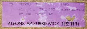 Alfons Mazurkiewicz (Dusseldorf 1922 - Wrocław 1975)- malarz związany z wrocławskim środowiskiem twórczym. Studia w PWSSP we Wrocławiu ukończył w 1953 roku. Założył wrocławską „Grupę X”. Od 1964 był pedagogiem w macierzystej uczelni. Brał udział w wielu wystawach sztuki polskiej w kraju i zagranicą. Tworzył kompozycje abstrakcyjne, w których przedstawiał dynamiczną wizję natury. Obrazy jego charakteryzuje gęsta, niemal reliefowa materia malarska tworząca falujące kręgi i formy wypełniające przestrzeń płótna. W 25 rocznicę śmierci artysty Muzeum Narodowe we Wrocławiu, Galeria BWA Awangarda i Galeria Stara w Lublinie zorganizowały dużą wystawę dzieł Mazurkiewicza.