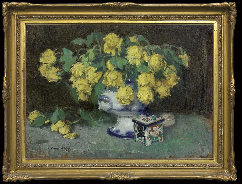 Alfons Karpiński (Rozwadów, dziś dzielnica Stalowej Woli 1875 - Kraków 1961) w latach 1891-1899 studiował w krakowskiej Szkole Sztuk Pięknych pod kierunkiem Floriana Cynka, Izydora Jabłońskiego, Władysława Łuszczkiewicza i Leona Wyczółkowskiego, a następnie kształcił się jeszcze u Antona Ažbégo w Monachium (1903), u Kazimierza Pochwalskiego w Wiedniu, a od 1907 także w Paryżu. Podróżował do Włoch i Londynu. Stale mieszkał w Krakowie; związany z tamtejszym środowiskiem skupionym wokół „Zielonego Balonika” projektował dekoracje do przedstawień kabaretu. Należał do Tow. Artystów Polskich „Sztuka”, grupy „Zero”, był członkiem wiedeńskiego stowarzyszenia „Secesja” i krakowskiego TPSP. Uczestniczył w wielu wystawach w kraju i za granicą. W czasie I wojny światowej służył w armii austriackiej. Na bogatą twórczość artysty składają się wczesne sceny rodzajowe z podkrakowskiej wsi, pejzaże i portrety, wśród nich zwłaszcza portrety kobiece, które przyniosły mu szczególną popularność. Z czasem głównym – obok portretu – tematem jego obrazów stały się martwe natury z kwiatami, dekoracyjne kompozycje o stonowanej gamie barwnej. Artysta zajmował się także grafiką i ilustratorstwem.
