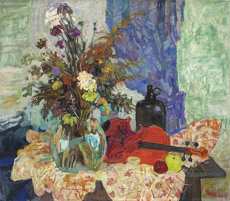Jan Szancenbach (Kraków 1928 - Kraków 1998) studiował w latach 1940-1942 w Kunstgewerbeschule (czyli ASP zdegradowanej przez okupanta do roli szkoły zawodowej) pod kierunkiem m.in. Stanisława Kamockiego, Józefa Mehoffera, Andrzeja Jurkiewicza. Po zamknięciu uczelni, w latach 1942-1945 pracował zarobkowo i samodzielnie studiował. W 1945 został przyjęty ponownie na II rok studiów, które ukończył pod kierunkiem Eugeniusza Eibischa w 1948 (dyplom uzyskał w 1952). Od 1948 pracował jako asystent w macierzystej pracowni oraz w pracowni liternictwa i projektowania graficznego Ludwika Gardowskiego. Przeszedł wszystkie szczeble kariery akademickiej, od asystenta do profesora zwyczajnego (od 1986). Od 1972 prowadził własną katedrę na Wydziale Malarstwa. W latach 1987-1993 przez dwie kadencje był rektorem ASP w Krakowie. Jako malarz pozostawał wierny szkole koloryzmu polskiego, którego zasady przyswoił sobie w trakcie studiów u Eibischa. Jego malarstwo jest pełne światła i nasyconych barw, radosne, wręcz feeryczne. Obok wybitnych walorów kolorystycznych (zwłaszcza w czerwieniach malarz osiągał niezwykłą skalę odmian i odcieni) nie stroni od dekoratywizmu, co razem składa się na hedonistyczny, beztroski wyraz. Znany przede wszystkim jako twórca martwych natur, pejzaży, scen w ogrodach, Szancenbach zajmował się również malarstwem monumentalnym. Pracował m. in. przy renowacji Teatru im. Słowackiego w Krakowie oraz widowni i plafonu Opery we Wrocławiu. Innym wątkiem jego sztuki było projektowanie graficzne (znaki firmowe, plakaty, okładki, opakowania, etykiety, znaczki pocztowe itp.), zajmował się również ilustracją książkową i filmem rysunkowym.