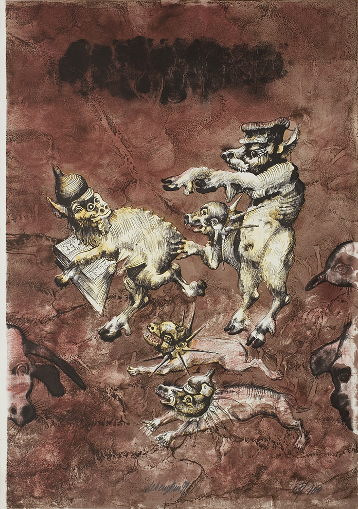 Jan Lebenstein (Brześć Litewski 1930 - Kraków 1999) w latach 1948-1954 studiował malarstwo w ASP w Warszawie pod kierunkiem prof. Eugeniusza Eibischa i Artura Nachta-Samborskiego. W 1955 wziął udział w wystawie w warszawskim Arsenale. Zaprzyjaźniony w czasie studiów z Mironem Białoszewskim, swą pierwszą wystawę indywidualną pokazał w 1956 w Teatrze na Tarczyńskiej. W 1959 zdobył Grand Prix de la Ville de Paris na I Biennale Młodych w Paryżu i w tym roku przeniósł się na stałe do Paryża. Po seriach "figur kreślonych" (na papierze milimetrowym) i "figur hieratycznych" z lat 1955-1958 maluje cykl "figur osiowych" (1958-1962), które wystawia w Paryżu i USA. Równolegle w 1960 zaczyna rysowane "karnety", rodzaj dziennika, który w przyszłości dostarczy motywów wykorzystanych w obrazach. W latach 1964-1965 maluje "Bestiarium", cykl fakturowych, archaizowanych stworów przypominających prehistoryczne wykopaliska. Bezpośrednio po nich wprowadza do swych obrazów postaci ludzkie i fantastyczne, odgrywające sceny ni to mitologiczne, ni to ze snu, często przesycone erotyką. W 1970 projektuje witraże dla Centre du Dialogue w Paryżu. W W 1971 otrzymuje obywatelstwo francuskie 1974 powstają gwasze inspirowane Folwarkiem zwierzęcym George'a Orwella. W latach 1976-1989 tworzy wyłącznie w technice gwaszu i pastelu, podejmując tematykę mitologiczną i zaczerpniętą z Biblii: cykle ilustracji do Księgi Hioba (wyd. 1979) i do Apokalipsy (wyd. 1986) w nowych przekładach Czesława Miłosza. W 1989 powraca do malarstwa olejnego (cykl "Pergamon"). Artysta otrzymał m. in. nagrodę Fundacji im. Alfreda Jurzykowskiego w 1976, Nagrodę Muzeum Archidiecezji Warszawskiej w 1985, Nagrodę im. Jana Cybisa w 1987.