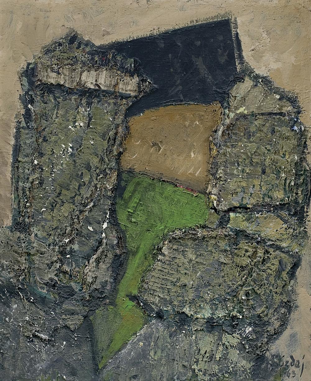 Aleksander Kobzdej (Olesko na Ukrainie 12 IX 1920 - Warszawa 25 IX 1972) od wczesnego dzieciństwa mieszkał we Lwowie, gdzie w 1939 zdał maturę. Równolegle z nauką w szkole średniej uczył się prywatnie rysunku i rzeźby. Jesienią 1939 rozpoczął studia architektoniczne na Politechnice Lwowskiej i jednocześnie zaczął malować pod okiem Władysława Lama. Pod obiema okupacjami, sowiecką i hitlerowską, podejmował prace zarobkowe, kontynuując w miarę możności studia. W 1944 został wywieziony na roboty przymusowe do Wiednia, skąd uciekł do Jugosławii. W 1945 wrócił do kraju. Krótko studiował w ASP w Krakowie u Eugeniusza Eibischa, by już pod koniec 1945 objąć stanowisko asystenta swego dawnego nauczyciela, Władysława Lama, na Wydziale Architektury Politechniki Gdańskiej. Pracując ukończył politechnikę z dyplomem inżyniera i od 1947 zaczął uczyć w PWSSP w Sopocie. Pracował tam do 1951, kiedy to przeniósł się do ASP w Warszawie, gdzie nauczał aż do śmierci. W latach 40. ulegał w swych próbach malarskich wpływom koloryzmu, kierunku triumfującego zarówno w Akademii krakowskiej, gdzie zaczynał studia, jak i w „szkole sopockiej“, w której sam uczył. Koloryzm Kobzdeja był jednakże poddany dyscyplinie skupionej, syntetycznej formy o rodowodzie sięgającym kubizmu i ekspresjonizmu. W pierwszej połowie lat 50. Kobzdej należał do koryfeuszy socrealizmu. Na ile artysta nie unikał, nawet w tym czasie, ironicznej refleksji, świadczy dyptyk złożony z obrazów Podaj cegłę i Ceglarki, w którym skonfrontował postulatywną i rzeczywistą stronę trudu codziennej pracy. W latach 50. rozwinął też swój talent rysownika, tworząc cykle reportażowych notatek z podróży do Chin i Wietnamu. Od 1956 radykalnie zmienił styl, doświadczając odtąd rozmaitych odmian informelu i malarstwa materii. Eksperymentując z fakturą i przestrzenią doszedł do swego głównego motywu, m stał się wielki cykl „Szczelin“, tworzonych od 1966. Ich syntezą stały się obiekty malarskie zwane „Hors cadre“.