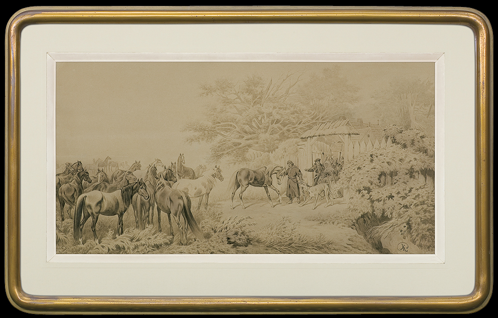 Juliusz Kossak (Wiśnicz 1824 - Kraków 1899) - malarz i ilustrator - był jednym z najpopularniejszych artystów polskich 2. połowy XIX wieku. Naukę rysunku i malarstwa rozpoczął we lwowskiej pracowni Jana Maszkowskiego; później wiele rysował z natury odwiedzając majątki szlacheckie na Ukrainie, Podolu i Wołyniu. W roku 1852 był w Wiedniu, na Węgrzech i w Petersburgu, a następnie zamieszkał na stałe w Warszawie. Lata 1856-1860 spędził w Paryżu, gdzie przyjaźnił się z Horacem Vernetem. Powróciwszy do Warszawy w latach 1862-1868 był kierownikiem artystycznym „Tygodnika Ilustrowanego”. W roku 1869 przeniósł się na stałe do Krakowa, skąd wyjeżdżał jeszcze do Monachium, by malować w atelier batalisty Franza Adama. Kossak był przede wszystkim znakomitym akwarelistą; rzadziej posługiwał się techniką olejną. Malował obrazy historyczne i batalistyczne, sceny rodzajowe ilustrujące życie i tradycje dworu szlacheckiego oraz obyczaje polskiego ludu. Ale prawdziwymi bohaterami jego obrazów były konie, których ruch, temperament, charakter i indywidualność potrafił po mistrzowsku przedstawić. Był także autorem wielu ilustracji do czasopism i książek, trafiającym bezbłędnie tak w klimat utworów literackich, jak i w tęsknoty i potrzeby odbiorców - czytelników Pieśni o ziemi naszej Wincentego Pola, Trylogii Henryka Sienkiewicza, Pana Tadeusza i poematów Adama Mickiewicza.