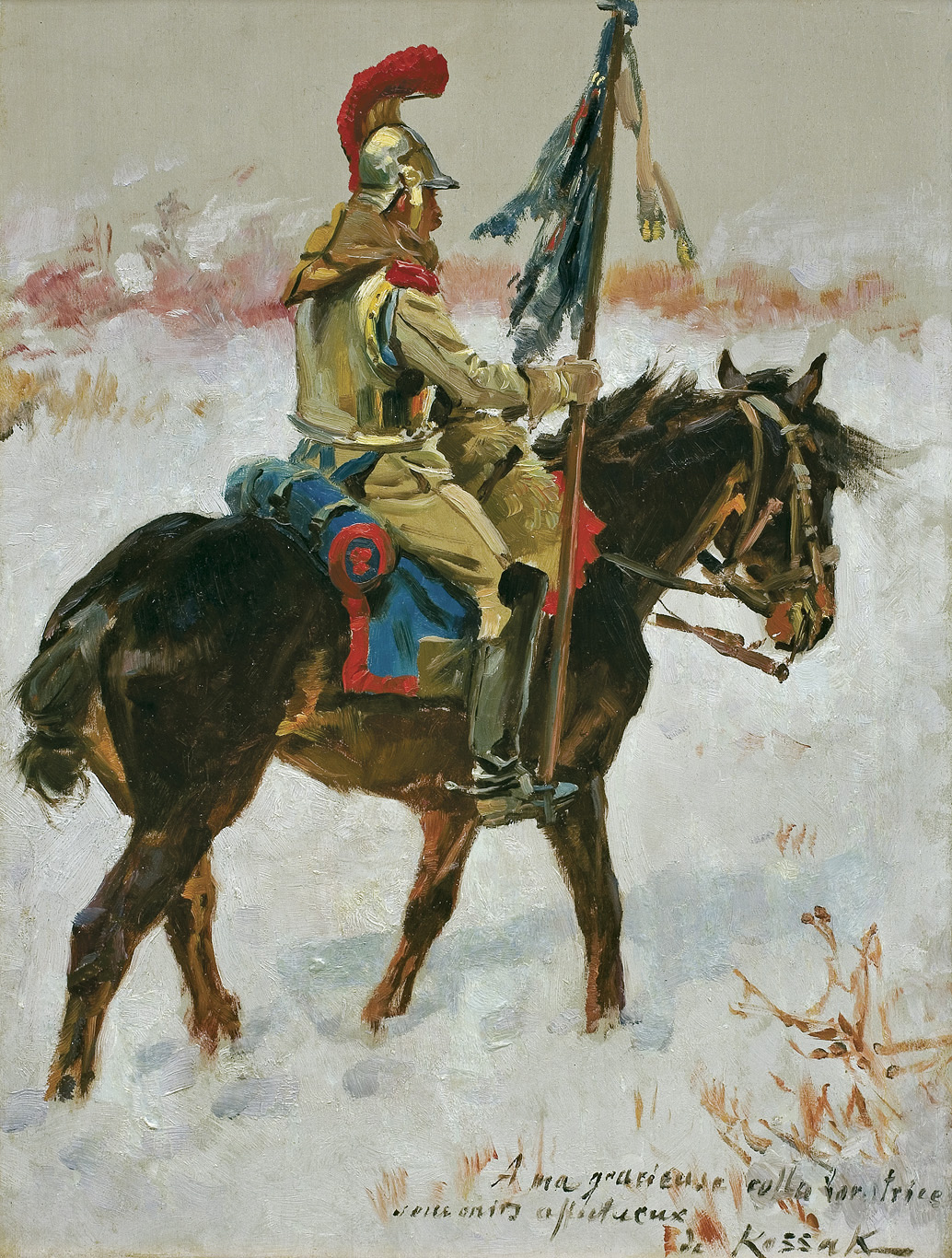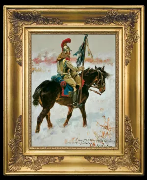 Wojciech Kossak (Paryż 1856 - Kraków 1942 ) – powszechnie znany malarz, postrzegany przede wszystkim jako świetny batalista. Syn i uczeń Juliusza Kossaka kształcił się w krakowskiej Szkole Sztuk Pięknych, w Akademii monachijskiej oraz w Paryżu. W latach 1895-1902 przebywał głównie w Berlinie, pracując dla cesarza Wilhelma II. Wiele podróżował, m.in. do Hiszpanii i Egiptu, gdzie wykonywał szkice do zamierzonych panoram. W późniejszych latach kilkakrotnie wyjeżdżał do Stanów Zjednoczonych wykonując zamówienia portretowe. W 1913 był mianowany profesorem warszawskiej Szkoły Sztuk Pięknych. W latach I wojny światowej pełnił służbę wojskową. Był współautorem panoram: „Racławice” (1893-1894), „Berezyna” (1895-1896), „Bitwa pod piramidami” (1901) oraz szkiców do niezrealizowanej „Somosierry” (1900). Z temperamentem i swobodą tworzył szeroko malowane, dynamiczne sceny batalistyczne, historyczne, rodzajowe oraz liczne portrety. Z upodobaniem malował konie. Jego obrazy, gloryfikujące dawne i współczesne artyście polskie wojsko i bohaterstwo żołnierzy, trafiały do patriotycznych uczuć odbiorców i cieszyły się ogromna popularnością.