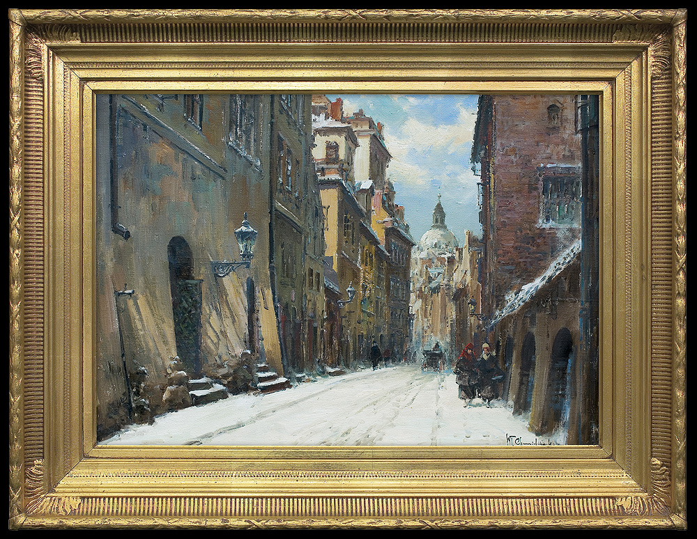 Władysław Chmieliński (Warszawa 1911 - Warszawa 1979) był malarzem związanym z Warszawą, gdzie stale mieszkał i pracował. W latach 1926-1931 studiował w warszawskiej Miejskiej Szkole Sztuk Zdobniczych i Malarstwa (dawna Klasa Rysunkowa). Wiodącym tematem jego obrazów były widoki miejskie, malowane olejno i akwarelą. W latach 1935-1938 stworzył cykl akwarel przedstawiających obiekty polskiej architektury; wśród nich, widoki Sandomierza, Krakowa, Kazimierza nad Wisłą, a także wnętrza zabytkowych kościołów czy pałaców, m.in. Zamku Królewskiego w Warszawie i Pałacu w Wilanowie. Malował także pejzaże i wiejskie sceny rodzajowe – kuligi, sanny, zaprzęgi, wesela, konie na tle krajobrazu. W latach 1967-1969 wyjeżdżał na dłuższe pobyty do Danii. W latach 1936-1939 artysta używał także pseudonimu „Władysław Stachowicz”.