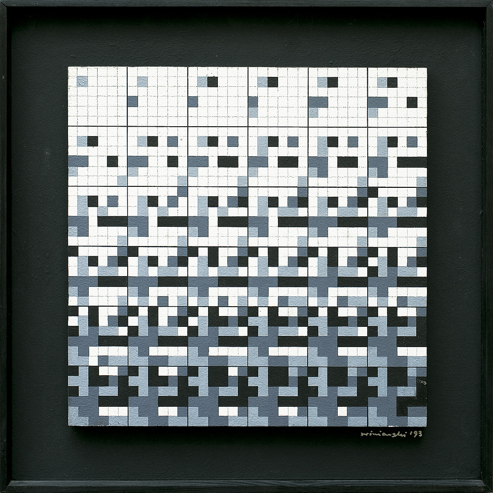 Ryszard Winiarski (Lwów 1936 - Warszawa 2006) ukończył w 1959 Politechnikę Warszawską i podjął studia malarskie w ASP w Warszawie (1960-1966). Pod koniec studiów, w 1965 sformułował własny program artystyczny i zrealizował pierwsze prace z serii pt. „Próby wizualnej prezentacji rozkładów statystycznych“. Otrzymał za nie I nagrodę na Sympozjum Artystów i Naukowców w Puławach w 1966. Jako stałe moduły prac przyjął kwadraty w kolorach czerni i bieli, których kolejnością i rozmieszczeniem rządzi przypadek - rzut kostką do gry, losowanie lub wybór liczb przypadkowych. W 1970 wprowadził do swych prac trzeci wymiar w formie obrazów przestrzennych lub jako iluzję przestrzeni uzyskaną przez wykreślanie perspektywy linearnej. W 1971 powstały pierwsze obrazy z wmontowanymi lustrami. Od 1972 artysta aranżował też „gry“ z udziałem widzów, którzy stosując jego środki i metodę wypełniali płaszczyznę czy pomieszczenie własną „wystawą“. Od ok. 1983 Winiarski włączył do swych prac elementy znaczeniowe, symboliczne i odwołujące się do emocji, jak kształt krzyża, naturalne materiały i zabiegi na nich, np. gięcie (instalacje: Geometria w stanie napięcia, 1984, Czarny kwadrat czyli fruwająca geometria, 1984, Hommage dla Henryka Stażewskiego, 1989). Równolegle artysta od 1960 uprawiał scenografię teatralną, będąc autorem kilkudziesięciu realizacji w tej dziedzinie w teatrach całej Polski. Uczestniczył w wielkiej liczbie wystaw w Polsce i za granicą, w tym: Biennale w Sao Paulo 1969, I i II Biennale des Konstruktivismus, Norymberga 1969 i 1971, Konstrukcja w procesie, Łódź 1981 i Monachium 1985. Zmarł 4 grudnia 2006 w Warszawie.