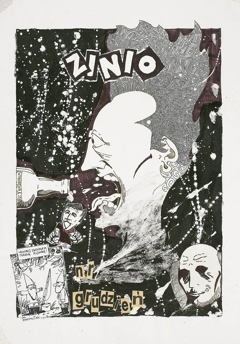 collage, tusz, flamastry, papier