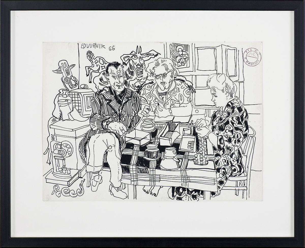 Edward Dwurnik (Radzymin 19 IV 1943 - Warszawa 28 X 2018) studiował malarstwo w ASP w Warszawie (1963-1970), jednak jako swego „mistrza“ wymienia Nikifora. Jego to prace, zobaczone po raz pierwszy w 1965, zainspirowały ówczesnego studenta III roku do narysowania pierwszych prac z cyklu „Podróże autostopem“, które kontynuował w nastepnych latach. W 1972-1978 powstawał cykl „Sportowcy“, w którym portretowane były, dodajmy - kąśliwie, typowe postaci z lat 70. Równolegle od 1975 powstawał cykl „Robotnicy“, który kulminował w okresie „Solidarności“ 1980-1981. Za prace z tego cyklu Dwurnik otrzymał w 1981 Nagrodę Krytyki Artystycznej im. Cypriana Kamila Norwida, natomiast za obrazy z cyklu „Warszawa“ (1981), proroczo zapowiadające stan wojenny - Nagrodę Kulturalną „Solidarności“ podziemnej w 1983. W latach 80. malarstwo Dwurnika przybrało wyraz ekspresyjny i dramatyczny. Powstające w tej dekadzie obrazy miały niejednokrotnie wymowę polityczną, przybierały też kostium historyczny, tak czy inaczej odnoszący się do współczesnych spraw i realiów. Cykl „Droga na Wschód“ (1989-91) upamiętniał ofiary stalinizmu, natomiast cykl „Od Grudnia do Czerwca“ (1990-94) - ofiary stanu wojennego. Zarówno ideowe, jak i czysto malarskie walory tych prac przyniosły artyście ogromne uznanie, zarówno w kraju jak i za granicą. Jego wyrazem była prestiżowa nagroda Fundacji Coutts & Co w Zurychu (1992). W latach 90. powstają cykle będące kontynuacją „Podróży autostopem“: „Niebieskie miasta“ (od 1993) i „Diagonale“ (od 1996), jak również kompozycje nowego typu, jak widoki morskie (cykl „Błękitne“, 1992-93) czy cykl „Wyliczanka“ (1996-99). Artysta wiele wystawia, miał ok. 100 wystaw indywidualnych w Polsce i za granicą, brał też udział w licznych wystawach i festiwalach krajowych i międzynarodowych, m.in.: X Biennale Sztuki Współczesnej, Menton 1974, Documenta 7, Kassel 1982, 5th Biennale, Sydney 1985, XIX Biennale Sztuki, Sao Paulo 1987; Olimpiada Sztuki, Seul 1988. Równolegle z malarstwem uprawiał rysunek, collage, grafikę warsztatową (litografia, techniki metalowe, kserografia, stemple) i użytkową (ilustracja, plakaty do własnych wystaw indywidualnych).