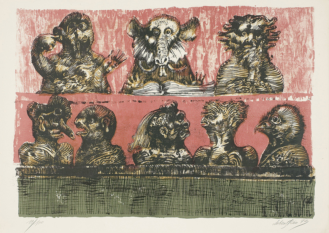 Jan Lebenstein (Brześć Litewski 1930 - Kraków 1999) w latach 1948-1954 studiował malarstwo w ASP w Warszawie pod kierunkiem prof. Eugeniusza Eibischa i Artura Nachta-Samborskiego. W 1955 wziął udział w wystawie w warszawskim Arsenale. Zaprzyjaźniony w czasie studiów z Mironem Białoszewskim, swą pierwszą wystawę indywidualną pokazał w 1956 w Teatrze na Tarczyńskiej. W 1959 zdobył Grand Prix de la Ville de Paris na I Biennale Młodych w Paryżu i w tym roku przeniósł się na stałe do Paryża. Po seriach "figur kreślonych" (na papierze milimetrowym) i "figur hieratycznych" z lat 1955-1958 maluje cykl "figur osiowych" (1958-1962), które wystawia w Paryżu i USA. Równolegle w 1960 zaczyna rysowane "karnety", rodzaj dziennika, który w przyszłości dostarczy motywów wykorzystanych w obrazach. W latach 1964-1965 maluje "Bestiarium", cykl fakturowych, archaizowanych stworów przypominających prehistoryczne wykopaliska. Bezpośrednio po nich wprowadza do swych obrazów postaci ludzkie i fantastyczne, odgrywające sceny ni to mitologiczne, ni to ze snu, często przesycone erotyką. W 1970 projektuje witraże dla Centre du Dialogue w Paryżu. W W 1971 otrzymuje obywatelstwo francuskie 1974 powstają gwasze inspirowane Folwarkiem zwierzęcym George'a Orwella. W latach 1976-1989 tworzy wyłącznie w technice gwaszu i pastelu, podejmując tematykę mitologiczną i zaczerpniętą z Biblii: cykle ilustracji do Księgi Hioba (wyd. 1979) i do Apokalipsy (wyd. 1986) w nowych przekładach Czesława Miłosza. W 1989 powraca do malarstwa olejnego (cykl "Pergamon"). Artysta otrzymał m. in. nagrodę Fundacji im. Alfreda Jurzykowskiego w 1976, Nagrodę Muzeum Archidiecezji Warszawskiej w 1985, Nagrodę im. Jana Cybisa w 1987.