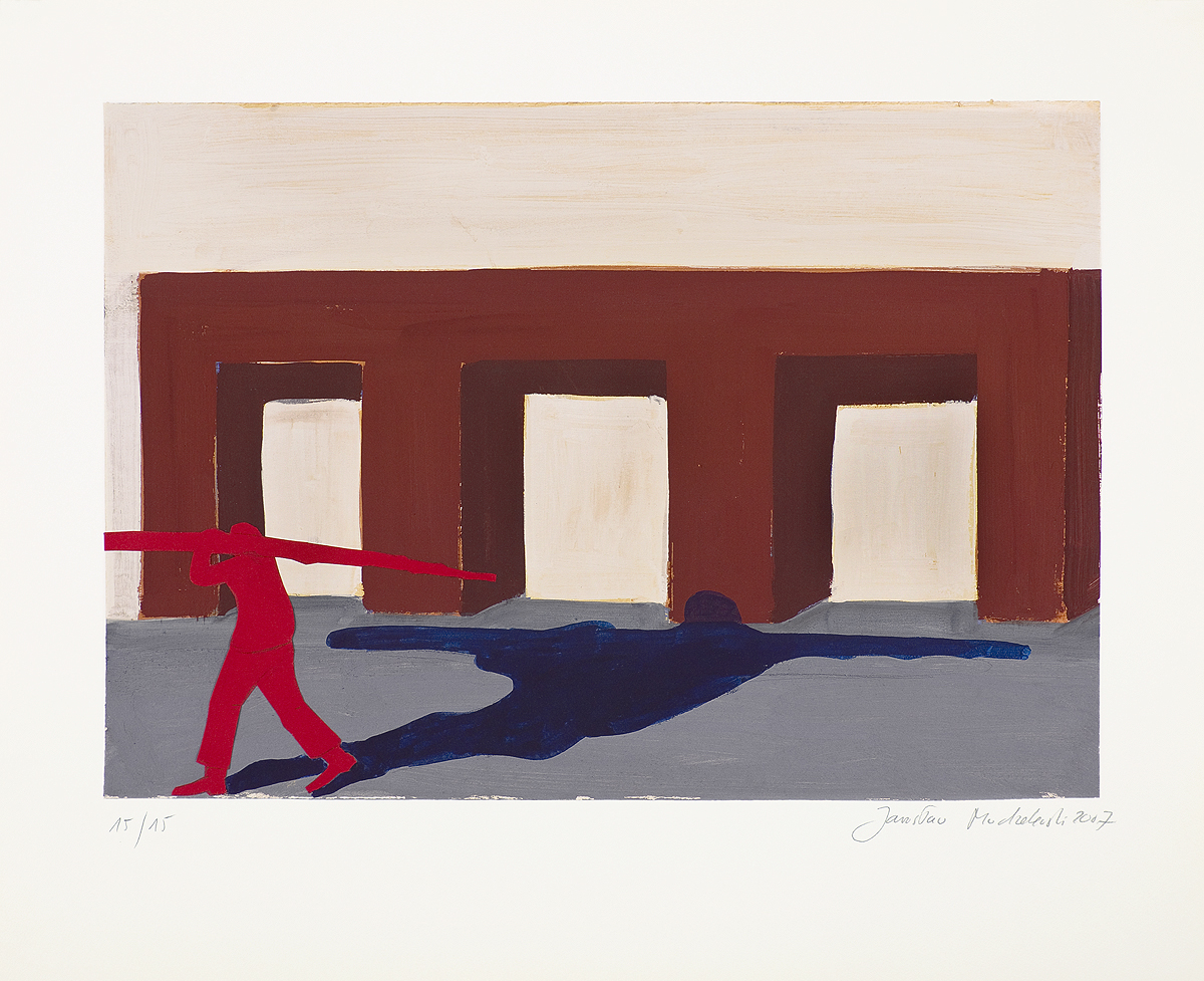 Jarosław Modzelewski (Warszawa 1955, mieszka w Warszawie) studiował malarstwo w ASP w Warszawie w latach 1975-1980, uzyskując dyplom w pracowni Stefana Gierowskiego. Od 1982 pracuje jako pedagog na macierzystym wydziale. W 1982 był współzałożycielem „Gruppy”, najważniejszego ugrupowania nurtu nowej ekspresji lat 80., działającego do 1992. W latach 1991-1996 wspólnie z Markiem Sobczykiem prowadził prywatną Szkołę Sztuki w Warszawie. Od wielu lat współpracuje z Galerią Zderzak w Krakowie. W początkowym okresie twórczości skłaniał się ku abstrakcji, wykorzystywał uproszczone znaki i emblematy oraz sylwetki odbite z szablonu. W 1985 namalował cykl oparty na ilustracjach do podręczników języka rosyjskiego, obrazujący proste czynności, których czasownikowe określenia stanowią tytuły prac. W 1986-1989 powstawały obrazy utrzymane w konwencji realistycznej, jednak zarazem o surrealnej atmosferze uzyskiwanej różnymi metodami, np. przez dublowanie figur, ukazywanie postaci w sytuacji niepewności czy zagrożenia, zabiegi z przestrzenią. W grupie obrazów z 1988 artysta rezygnuje z postaci ludzkiej na rzecz wyjątkowego nasycenia emocją samej przestrzeni pejzaży i wnętrz. Około 1990 wraca do kompozycji akcentujących czynności wykonywane przez postaci, które często umieszczone są w pustej, zaledwie zasugerowanej, acz dominującej przestrzeni. Odrealnienia i monumentalności dodaje tym obrazom płaskie i rozległe kładzenie koloru.