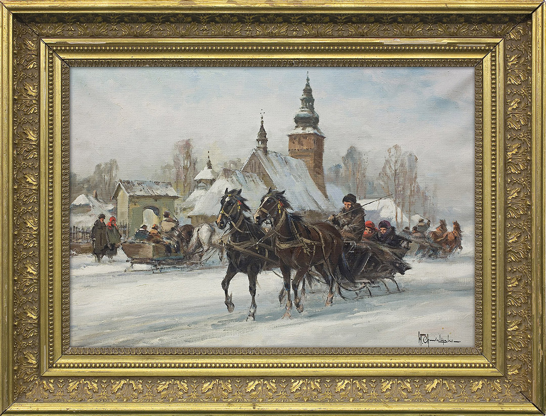 Władysław Chmieliński (Warszawa 1911 - Warszawa 1979) był malarzem związanym z Warszawą, gdzie stale mieszkał i pracował. W latach 1926-1931 studiował w warszawskiej Miejskiej Szkole Sztuk Zdobniczych i Malarstwa (dawna Klasa Rysunkowa). Wiodącym tematem jego obrazów były widoki miejskie, malowane olejno i akwarelą. W latach 1935-1938 stworzył cykl akwarel przedstawiających obiekty polskiej architektury; wśród nich, widoki Sandomierza, Krakowa, Kazimierza nad Wisłą, a także wnętrza zabytkowych kościołów czy pałaców, m.in. Zamku Królewskiego w Warszawie i Pałacu w Wilanowie. Malował także pejzaże i wiejskie sceny rodzajowe – kuligi, sanny, zaprzęgi, wesela, konie na tle krajobrazu. W latach 1967-1969 wyjeżdżał na dłuższe pobyty do Danii. W latach 1936-1939 artysta używał także pseudonimu „Władysław Stachowicz”.