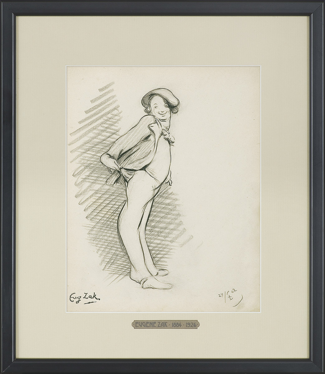 Eugeniusz Zak (Żak) (Mogilno/Mohylno w dawnej guberni mińskiej 1884 – Paryż 1926) dzieciństwo spędził w Mogilnie (Mohylnie) i (od 1892) w Warszawie. W roku 1902 wyjechał do Paryża, gdzie studiował w École des Beaux-Arts u Jeana Léona Gérôme’a i w Académie Colarossi u Alberta Besnarda. W 1903 podróżował do Włoch, był w Rzymie, we Florencji, Pizie, Mediolanie. Następnie pojechał do Monachium, gdzie przez pół roku kształcił się u Antona Ažbego. W 1904 powrócił do Paryża i zadebiutował w Salonie Jesiennym. W Paryżu pozostał do 1914, później przeniósł się do Vence i Nicei. Lata 1916-1921 spędził w Polsce. W 1921 wyjechał do Niemiec; mieszkał w Bonn (gdzie wykonał polichromie do willi architekta F.A. Breuhausa), później w Berlinie. W 1923 wrócił do Paryża. Wiele wystawiał, biorąc m.in. udział w paryskich Salonach, w wystawach w Barcelonie (1912), Wenecji (Biennale 1914), Wiedniu (1915). Czynnie uczestniczył także w polskim życiu artystycznym – należał do Tow. Artystów Polskich „Sztuka”, wystawiał też z Formistami, był współzałożycielem ugrupowania „Rytm”. Był jednym z najwybitniejszych polskich artystów tzw. École de Paris. Inspiracji szukał w sztuce renesansu, w malarstwie Cezane’a i Picassa. We wcześniejszym okresie twórczości malował portrety oraz wykonywał – inspirowane sztuką renesansową – sangwinowe rysunki głów i popiersi. Malował też idealizowane, liryczne i poetyckie w nastroju sceny w pejzażu, a po 1920 kompozycje figuralne z jedną lub kilkoma postaciami pasterzy, tancerek, arlekinów we wnętrzach lub w pejzażu. Jego obrazy przesycone są łagodnym nastrojem melancholii i zadumy. Wiotkie sylwetki przedstawianych postaci artysta poddawał swoistej stylizacji – wydłużając proporcje i nadając im giętkie, niemal taneczne pozy. Obrazy te odznaczają się dekoracyjnością, rytmicznymi, „tanecznymi” układami form, miękkim światłocieniowym modelunkiem, a często także efektami fakturowymi.