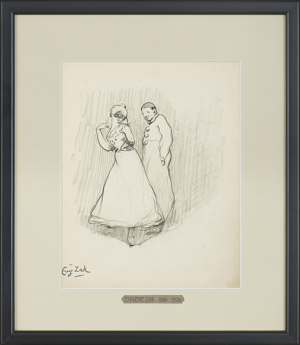 Eugeniusz Zak (Żak) (Mogilno/Mohylno w dawnej guberni mińskiej 1884 – Paryż 1926) dzieciństwo spędził w Mogilnie (Mohylnie) i (od 1892) w Warszawie. W roku 1902 wyjechał do Paryża, gdzie studiował w École des Beaux-Arts u Jeana Léona Gérôme’a i w Académie Colarossi u Alberta Besnarda. W 1903 podróżował do Włoch, był w Rzymie, we Florencji, Pizie, Mediolanie. Następnie pojechał do Monachium, gdzie przez pół roku kształcił się u Antona Ažbego. W 1904 powrócił do Paryża i zadebiutował w Salonie Jesiennym. W Paryżu pozostał do 1914, później przeniósł się do Vence i Nicei. Lata 1916-1921 spędził w Polsce. W 1921 wyjechał do Niemiec; mieszkał w Bonn (gdzie wykonał polichromie do willi architekta F.A. Breuhausa), później w Berlinie. W 1923 wrócił do Paryża. Wiele wystawiał, biorąc m.in. udział w paryskich Salonach, w wystawach w Barcelonie (1912), Wenecji (Biennale 1914), Wiedniu (1915). Czynnie uczestniczył także w polskim życiu artystycznym – należał do Tow. Artystów Polskich „Sztuka”, wystawiał też z Formistami, był współzałożycielem ugrupowania „Rytm”. Był jednym z najwybitniejszych polskich artystów tzw. École de Paris. Inspiracji szukał w sztuce renesansu, w malarstwie Cezane’a i Picassa. We wcześniejszym okresie twórczości malował portrety oraz wykonywał – inspirowane sztuką renesansową – sangwinowe rysunki głów i popiersi. Malował też idealizowane, liryczne i poetyckie w nastroju sceny w pejzażu, a po 1920 kompozycje figuralne z jedną lub kilkoma postaciami pasterzy, tancerek, arlekinów we wnętrzach lub w pejzażu. Jego obrazy przesycone są łagodnym nastrojem melancholii i zadumy. Wiotkie sylwetki przedstawianych postaci artysta poddawał swoistej stylizacji – wydłużając proporcje i nadając im giętkie, niemal taneczne pozy. Obrazy te odznaczają się dekoracyjnością, rytmicznymi, „tanecznymi” układami form, miękkim światłocieniowym modelunkiem, a często także efektami fakturowymi.