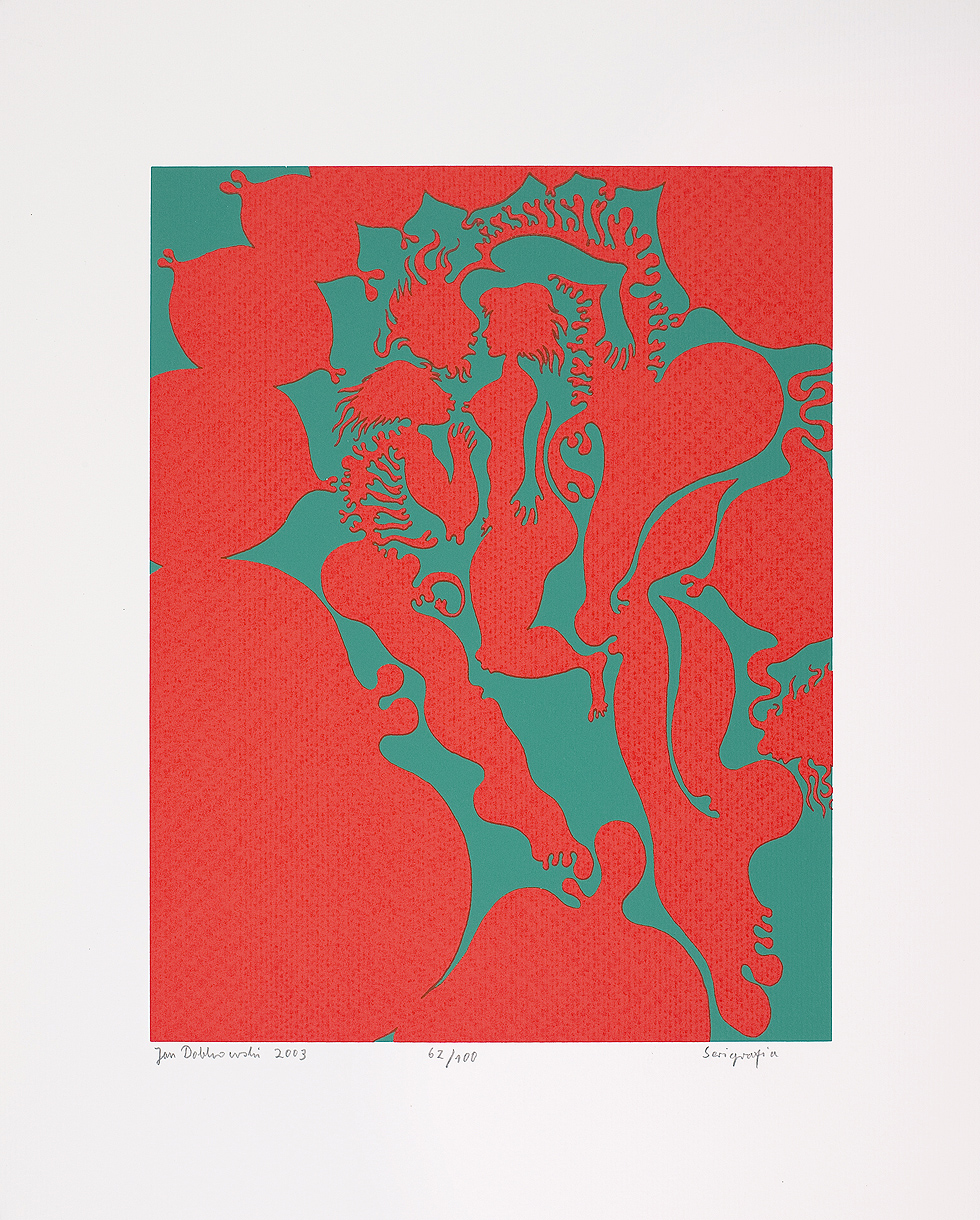 Jan Dobkowski (Łomża 1942, mieszka w Warszawie) studiował w latach 1962-1968 na Wydziale Malarstwa warszawskiej ASP pod kierunkiem prof. Juliusza Studnickiego i Jana Cybisa. Będąc jeszcze na studiach, w 1966, utworzył duet artystyczny, w którym jego partnerem był Jerzy (Jurry) Zieliński. Ich pierwsza wspólna wystawa pn. Neo-Neo-Neo odbyła się w Warszawie w 1967. Wystawiali wspólnie do 1970. W 1968 powstały pierwsze zielono-czerwone obrazy Dobkowskiego (używającego w tym czasie pseudonimu Dobson). W pracach tych, operujących giętkimi, falistymi liniami, w których upatrywano wpływów secesji, artysta używał sposobów rodem z op-artu dla wywołania złudzeń optycznych (wirowanie, mżenie, pozorny ruch form). Równolegle z obrazami tworzył też formy z płyt i folii do montowania w przestrzeni. Złoty medal na Sympozjum Złotego Grona w Zielonej Górze w 1971 i blisko roczny pobyt w USA na stypendium Fundacji Kościuszkowskiej w 1972 to kolejne etapy pełnej sukcesów kariery malarza. Wyraźną zmianę nastroju i wymowy jego prac przyniosły wydarzenia 1980-1981 roku, zwłaszcza wprowadzenie stanu wojennego. Monochromatyczne, ciemne płótna znaczył wtedy nikłymi, wiotkimi liniami rysunku. Najczęstszym motywem były patriotyczne i religijne symbole, dopowiadane tytułami nawiązującymi do realiów czasu. Kolejna radykalna zmiana nastąpiła ok. 1990. Symbolicznym zwiastunem nowego okresu stał się olbrzymi, radosny, eksplodujący bogactwem barw, kształtów i ruchu obraz ...a życie sobie płynie... (394 x 588 cm) z 1990-1991. Podobne cechy formalne charakteryzują twórczość artysty w całej dekadzie lat 90. Równolegle z malarstwem Dobkowski pracuje nad rysunkiem, będącym bardzo ważnym dopełnieniem jego twórczości.