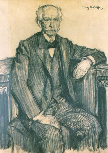 Józef Mehoffer (Ropczyce 1869-Wadowice 1946) - malarz, grafik, scenograf i pedagog; obok Stanisława Wyspiańskiego był najwybitniejszym polskim twórcą witraży i polichromii. Uczeń Jana Matejki i uczelni paryskich - Ecolé des Beaux Arts i Accadémie Colarossi - swą drogę twórczą rozpoczął w latach 1889-1891 od pracy nad polichromią Kościoła Mariackiego w Krakowie (pod kierunkiem Matejki). W roku 1895 otrzymał I nagrodę na międzynarodowym konkursie na witraże do kolegiaty we Fryburgu w Szwajcarii (ich realizacja trwała aż do 1934). W latach następnych otrzymywał różne inne zamówienia na witraże i polichromie, m.in. dla katedry na Wawelu i w Płocku, katedry Ormiańskiej we Lwowie, dla kościołów w Opawie, Onnes w Szwajcarii, w Jutrosinie, we Włocławku czy Przemyślu (nie wszystkie zrealizowane). Był wybitnym reprezentantem sztuki secesji. Tworzył dekoracyjnie traktowane portrety, w tym autoportrety i portrety żony, a także obrazy o zabarwieniu rodzajowym, które w latach 1895-1917 zyskiwały wymowę kompozycji symbolicznych. Malował także pejzaże łączące secesyjną dekoracyjność ze zdobyczami impresjonizmu. Z mistrzowską biegłością posługiwał się różnymi technikami - olejem, temperą, akwarelą i gwaszem - zajmował się także grafiką. Ostatnia wielka wystawa dzieł artysty, zatytułowana Opus magnum, odbyła się w roku 2000 w Muzeum Narodowym w Krakowie.
