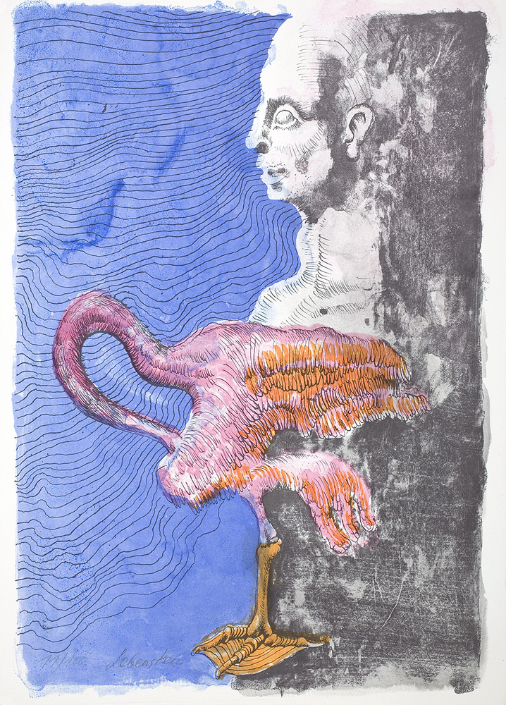 Jan Lebenstein (Brześć Litewski 1930 - Kraków 1999) w latach 1948-1954 studiował malarstwo w ASP w Warszawie pod kierunkiem prof. Eugeniusza Eibischa i Artura Nachta-Samborskiego. W 1955 wziął udział w wystawie w warszawskim Arsenale. Zaprzyjaźniony w czasie studiów z Mironem Białoszewskim, swą pierwszą wystawę indywidualną pokazał w 1956 w Teatrze na Tarczyńskiej. W 1959 zdobył Grand Prix de la Ville de Paris na I Biennale Młodych w Paryżu i w tym roku przeniósł się na stałe do Paryża. Po seriach "figur kreślonych" (na papierze milimetrowym) i "figur hieratycznych" z lat 1955-1958 maluje cykl "figur osiowych" (1958-1962), które wystawia w Paryżu i USA. Równolegle w 1960 zaczyna rysowane "karnety", rodzaj dziennika, który w przyszłości dostarczy motywów wykorzystanych w obrazach. W latach 1964-1965 maluje "Bestiarium", cykl fakturowych, archaizowanych stworów przypominających prehistoryczne wykopaliska. Bezpośrednio po nich wprowadza do swych obrazów postaci ludzkie i fantastyczne, odgrywające sceny ni to mitologiczne, ni to ze snu, często przesycone erotyką. W 1970 projektuje witraże dla Centre du Dialogue w Paryżu. W W 1971 otrzymuje obywatelstwo francuskie 1974 powstają gwasze inspirowane Folwarkiem zwierzęcym George'a Orwella. W latach 1976-1989 tworzy wyłącznie w technice gwaszu i pastelu, podejmując tematykę mitologiczną i zaczerpniętą z Biblii: cykle ilustracji do Księgi Hioba (wyd. 1979) i do Apokalipsy (wyd. 1986) w nowych przekładach Czesława Miłosza. W 1989 powraca do malarstwa olejnego (cykl "Pergamon"). Artysta otrzymał m. in. nagrodę Fundacji im. Alfreda Jurzykowskiego w 1976, Nagrodę Muzeum Archidiecezji Warszawskiej w 1985, Nagrodę im. Jana Cybisa w 1987.