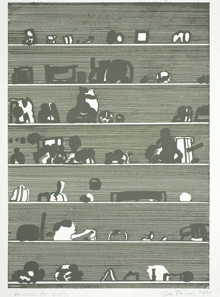 Jan Tarasin (Kalisz 11 IX 1926 - Warszawa 8 VIII 2009) studiował malarstwo w ASP w Krakowie pod kierunkiem prof. Zbigniewa Pronaszki (1946-1951). Jeszcze jako student zadebiutował na I Wystawie Sztuki Nowoczesnej w Krakowie w 1948/49. W połowie lat 50. stworzył cykle litografii: „Nowa Huta i jej mieszkańcy“, 1954, „Dom“, 1955). W pierwszym przeciwstawił się oficjalnemu optymizmowi, w drugim, operując symboliką martwej natury, zawarł treści egzystencjalne i odnoszące do niedawnego dramatu wojny. Po 1956 zaczął malować obrazy niefiguratywne. Układy wyodrębnionych elementów (określanych jako „przedmioty“) umieszczane były przez artystę na płaszczyźnie (cykl „Wnętrze“, 1957) ), lub w aluzyjnej przestrzeni (cykle „Uczta“, 1957, „Brzeg“, 1962-1964, „Przedmioty policzone“, od 1968, „Antykwariat“, 1968). Zasada ta utrzymuje się w jego malarstwie w następnych latach, różnice między okresami twórczości dotyczą sposobu opracowania „przedmiotów“ i ich usytuowania w przestrzeni obrazu lub wobec tła. Od lat 70. „przedmioty“ zmieniają się w graficzne, zwykle czarne znaki na jasnych tłach (cykl „Kolekcja“, od 1971). Tła z kolei bywają iluzyjnie przestrzenne, zróżnicowane walorowo, miękkie. W latach 90. artysta wrócił do kolorystycznego, bardziej malarskiego rozwiązywania zarówno znaków, jak i teł, często ciemnych lub przenikających się z „przedmiotami“ (cykl „Wylęgarnia przedmiotów“, 1992). Tarasin od 1962 jest członkiem „Grupy Krakowskiej“. W 1963-67 uczył na Wydziale Architektury Wnętrz krakowskiej ASP. W 1967 przeniósł się do Warszawy, w 1974 podjął pracę pedagogiczną na Wydziale Malarstwa ASP w Warszawie. W 1987-90 był rektorem tej uczelni. W 1976 otrzymał Nagrodę Krytyki Artystycznej im. Cypriana Kamila Norwida, w 1984 Nagrodę im. Jana Cybisa.; Nagroda na MB Sztuki w San Marino 1965. Równolegle z malarstwem zajmował się rysunkiem i grafiką - do lat 60. litografią, od 1974 serigrafią. W 1974-1981 wydał 8 autorskich „Zeszytów“ z serigrafiami i własnymi tekstami. W 1995 w Galerii Zachęta odbyła się wystawa artysty, której towarzyszył monograficzny katalog.