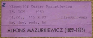 Alfons Mazurkiewicz (Dusseldorf 1922 - Wrocław 1975)- malarz związany z wrocławskim środowiskiem twórczym. Studia w PWSSP we Wrocławiu ukończył w 1953 roku. Założył wrocławską „Grupę X”. Od 1964 był pedagogiem w macierzystej uczelni. Brał udział w wielu wystawach sztuki polskiej w kraju i zagranicą. Tworzył kompozycje abstrakcyjne, w których przedstawiał dynamiczną wizję natury. Obrazy jego charakteryzuje gęsta, niemal reliefowa materia malarska tworząca falujące kręgi i formy wypełniające przestrzeń płótna. W 25 rocznicę śmierci artysty Muzeum Narodowe we Wrocławiu, Galeria BWA Awangarda i Galeria Stara w Lublinie zorganizowały dużą wystawę dzieł Mazurkiewicza.
