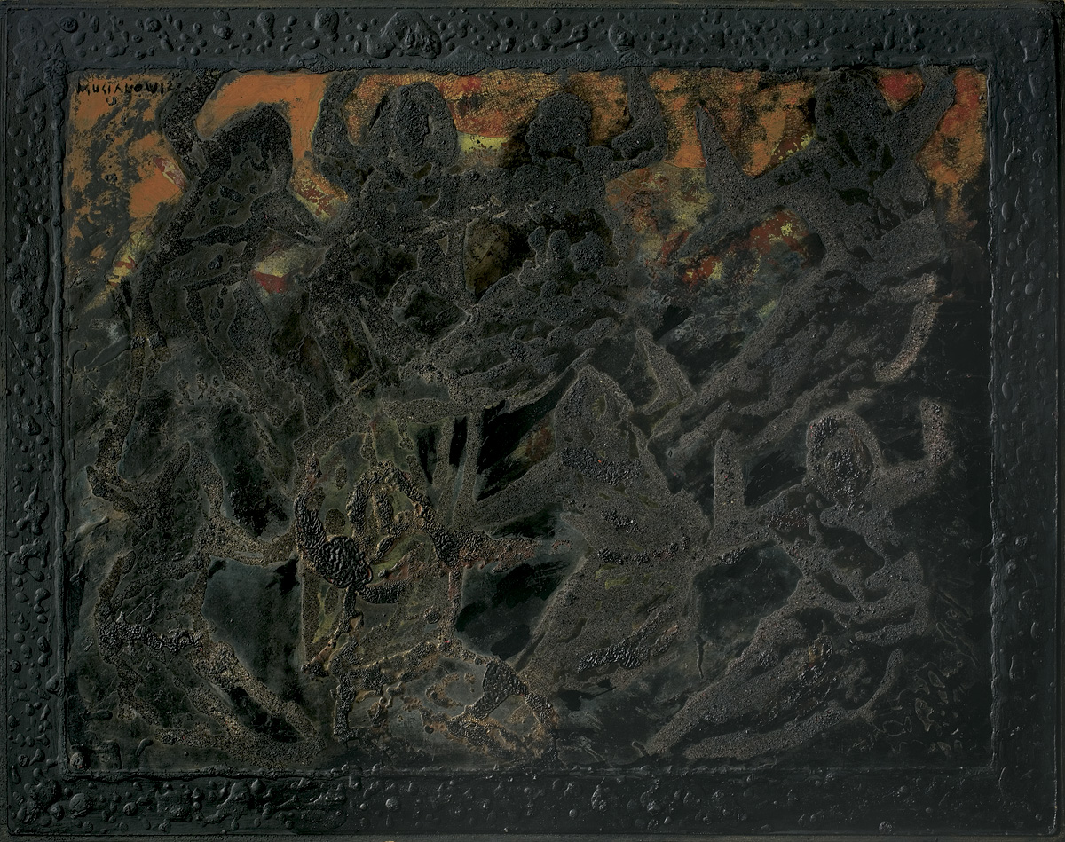 Henryk Musiałowicz (Gniezno 5 I 1914 - Warszawa 24 II 2015) od 1930 uczył się w Państwowej Szkole Sztuk Zdobniczych i Przemysłu Artystycznego w Poznaniu. W 1936 uzyskał absolutorium na Wydziale Malarstwa Dekoracyjnego i Witrażownictwa. W 1937 podjął studia malarskie w warszawskiej ASP pod kierunkiem Felicjana Kowarskiego i Leonarda Pękalskiego (dyplom pod kierunkiem tego pierwszego uzyskał w 1947). Lata okupacji spędził w Warszawie, kontynuując twórczość artystyczną (wykonywał w tym czasie m.in. ekslibrisy). Współpracował z Departamentem Informacji Delegatury Rządu na Kraj. Od 1940 związany był z grupą absolwentów warszawskiej uczelni, działającą w latach okupacji w tzw. Bacciarellówce na terenie Zamku Królewskiego, a po wojnie znaną jako grupa „Warszawa“. W sztuce Musiałowicza, zwłaszcza bezpośrednio po wojnie, silnie zaznaczyły się wątki związane z martyrologią, tragedią Powstania Warszawskiego, zburzeniem Warszawy, której ruiny upamiętnił w cyklu rysunków z 1945-1946. Poszukując formy odpowiedniej dla przeżyć wojennych, znalazł ją w sztuce Holendrów, zwłaszcza Rembrandta, którego twórczość poznał podczas podróży w 1956. Odtąd na stałe zdominował jego malarstwo ciemny koloryt, uspokojona, niekiedy hieratyczna kompozycja form zaledwie sugerujących figury ludzkie, bogata faktura i połyskliwość powierzchni. Z czasem artysta zaczął konstruować formy przestrzenne z drewna, jak zwykle pokrytego bogatą warstwą malarską, w wydłużonych stojących kształtach. Musiałowicz do 1983 aktywnie działał w ZPAP. Był członkiem międzynarodowych organizacji artystycznych, w tym kilku włoskich, jak Accademia Tibertina w Rzymie (od 1965), Accademia Italiana delle Arti e del Lavoro w Parmie (od 1979), Accademia Europea, Calvatone (od 1985). W 2002 wielką retrospektywę jego twórczości zorganizowało Muzeum Narodowe w Poznaniu.