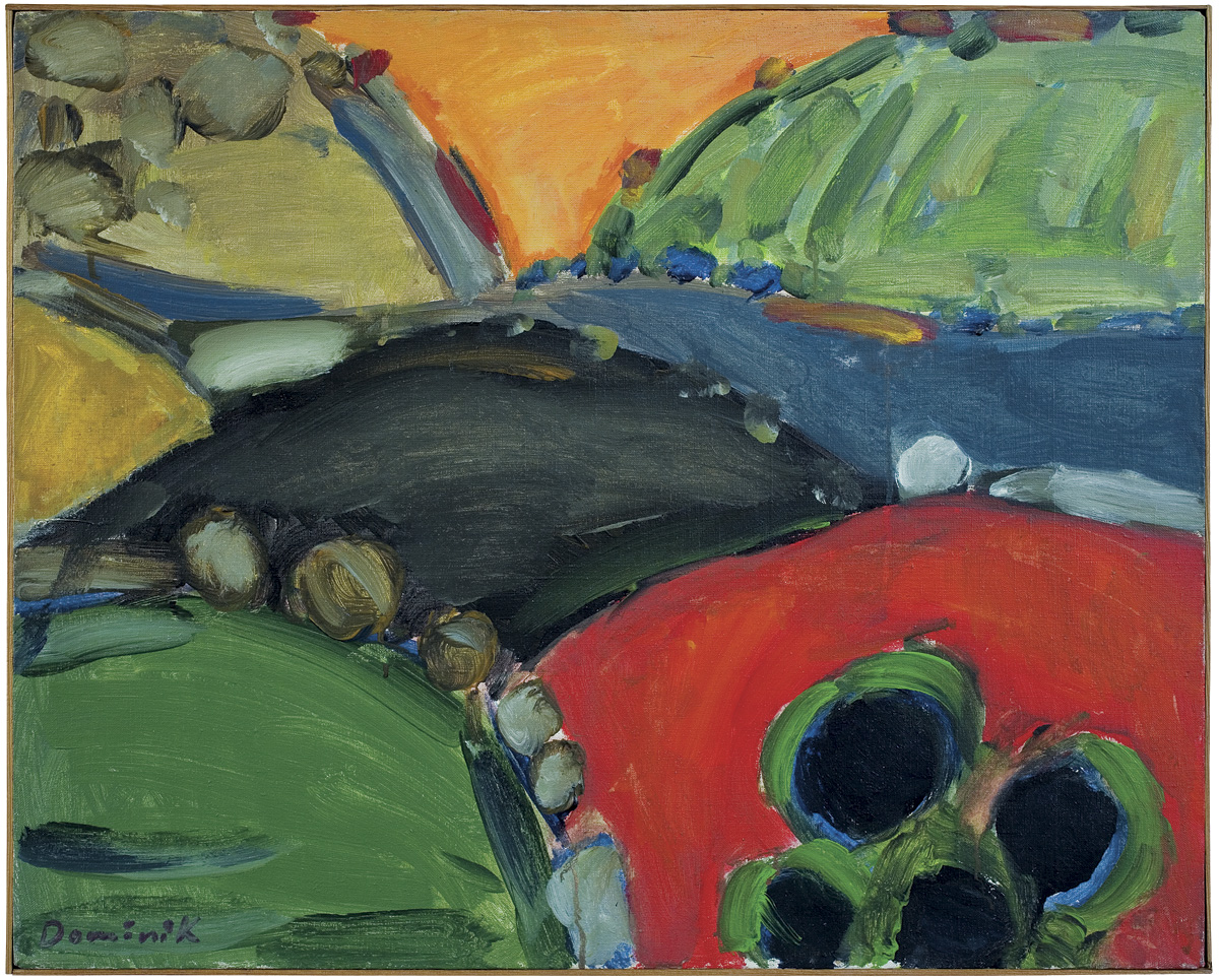 Tadeusz Dominik (Szymanów 14 I 1928 - Warszawa 20 V 2014) studiował na Wydziale Malarstwa ASP w Warszawie pod kierunkiem prof. J.Cybisa (1946-51, dyplom 1953). Od 1951 był pedagogiem na macierzystym Wydziale, początkowo jako asystent Cybisa. Od 1965 prowadził własną pracownię, w 1979 otrzymał tytuł profesora. W 1990 przeszedł na emeryturę. W czasie studiów oddziałały nań - za pośrednictwem osobowości i sztuki Cybisa - idee polskiego koloryzmu, które następnie twórczo i samodzielnie kontynuował. Początkowo tworzył obrazy figuratywne. Debiutował na słynnej wystawie w warszawskim Arsenale w 1955, gdzie zdobył nagrodę. W tym okresie obok malarstwa uprawiał drzeworyt, operujący szerokimi płaszczyznami bieli i czerni (drzeworyty wystawiał m.in. na Biennale w Wenecji w 1956). W drugiej poł. lat 50. zaczął malować obrazy abstrakcyjne, początkowo utrzymane w ekspresyjnej i spontanicznej stylistyce malarstwa informel. W latach 60. wzbogacił swe prace o efekty fakturowe. Niezmienną inspiracją była dla malarza natura, bogactwo i kolorystyka jej form. Pozostał jej wierny do dziś, poddając zmianom sam sposób malowania. Stopniowo rozjaśniał i wygładzał swe kompozycje, wprowadzając efekty dekoracyjne, jak rytmiczne powtórzenia form czy rodzaj malowanych „rastrów“, regularnie znaczących fragmenty kompozycji. Wśród wielu nagród otrzymał m.in. laur „Złotego Grona“ w Zielonej Górze w 1963, Grand Prix Festiwalu Polskiego Malarstwa Współczesnego w Szczecinie w 1968, nagrodę im. George’a Rowney’a w Londynie w 1973 i Nagrodę im. Jana Cybisa w Warszawie w 1973. Równolegle z malarstwem zajmował się gobelinem, ceramiką, również grafiką komputerową.