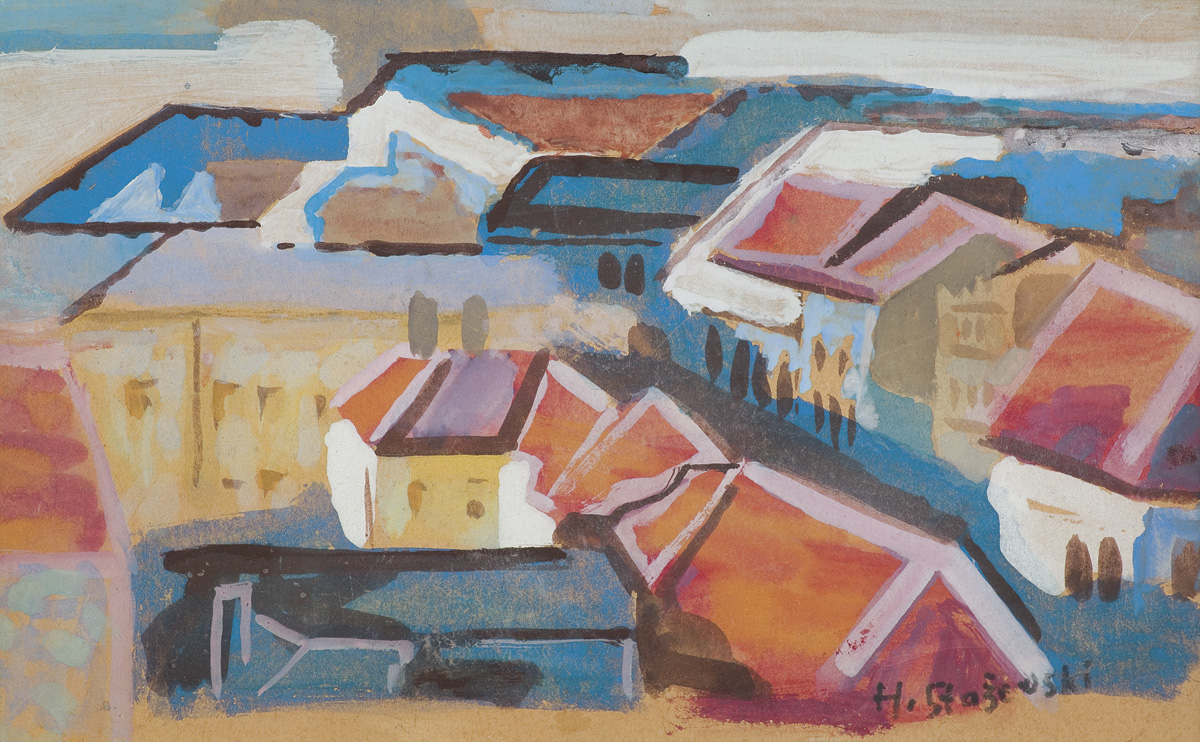 Henryk Stażewski (Warszawa 9 I 1894 - Warszawa 10 VI 1988) studiował w Szkole Sztuk Pięknych w Warszawie w latach 1913-1920. W początkach kariery malował martwe natury. Przejściowo wystawiał z ugrupowaniem „Formiści” (1922). Wziął też udział w Wystawie Nowej Sztuki w Wilnie w 1923. O tego czasu tworzył pod wpływem konstruktywizmu. Obok kompozycji malarskich trudnił się grafiką książkową, projektował wnętrza, sprzęty, a także scenografie – były to w większości prace teoretyczne i studyjne. Polskie i międzyna-rodowe ugrupowania awangardy, z którymi wystawiał i współpracował jako publicysta, to kolejno: „Blok” (1924-1926), „Praesens” (1926-1930), „Cercle et Carré” (1929-1931), „Abstraction-Création” (1931-1939), „a. r.” (1932-1939). Należał też do Koła Artystów Grafików Reklamowych (1933-1939). W 1930 był współorganizatorem zbiórki dzieł artystów międzynarodowej awangardy przeznaczonych dla muzeum łódzkiego (obecnie w Muzeum Sztuki w Łodzi). Po II wojnie mieszkał i działał w Warszawie. W latach 40. i 50. podejmował próby dostosowania się do postulatów sztuki figuratywnej. Z tego okresu pochodzą rysunkowe i malarskie kompozycje o tematyce pracy, budowy, a także projekty monumentalne. Po 1956, uznawany powszechnie za patrona polskiej awangardy, uprawiał już wyłącznie abstrakcję o konstruktywistycznym rodowodzie. Tworzył cykle prac, będących studiami płaszczyzn, linii, kolorów w różnych układach względem siebie. Przy pozorach chłodnej perfekcji umiał nasycić je emocją bezpośredniego dotknięcia, śladu ręki. Obok malarstwa i form pochodnych, jak collages, reliefy, multiple, tworzył formy przestrzenne i grafikę (autoryzował serigraficzne repliki swoich prac). Był laureatem wielu nagród i odznaczeń krajowych i zagranicznych, w tym Nagrody Herdera, Wiedeń 1972.