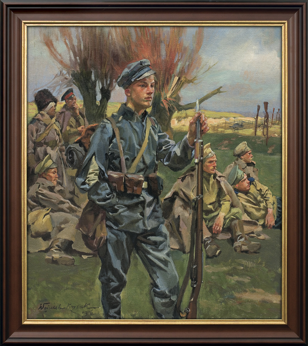 Wojciech Kossak (Paryż 1856 - Kraków 1942 ) – powszechnie znany malarz, postrzegany przede wszystkim jako świetny batalista. Syn i uczeń Juliusza Kossaka kształcił się w krakowskiej Szkole Sztuk Pięknych, w Akademii monachijskiej oraz w Paryżu. W latach 1895-1902 przebywał głównie w Berlinie, pracując dla cesarza Wilhelma II. Wiele podróżował, m.in. do Hiszpanii i Egiptu, gdzie wykonywał szkice do zamierzonych panoram. W późniejszych latach kilkakrotnie wyjeżdżał do Stanów Zjednoczonych wykonując zamówienia portretowe. W 1913 był mianowany profesorem warszawskiej Szkoły Sztuk Pięknych. W latach I wojny światowej pełnił służbę wojskową. Był współautorem panoram: „Racławice” (1893-1894), „Berezyna” (1895-1896), „Bitwa pod piramidami” (1901) oraz szkiców do niezrealizowanej „Somosierry” (1900). Z temperamentem i swobodą tworzył szeroko malowane, dynamiczne sceny batalistyczne, historyczne, rodzajowe oraz liczne portrety. Z upodobaniem malował konie. Jego obrazy, gloryfikujące dawne i współczesne artyście polskie wojsko i bohaterstwo żołnierzy, trafiały do patriotycznych uczuć odbiorców i cieszyły się ogromna popularnością.