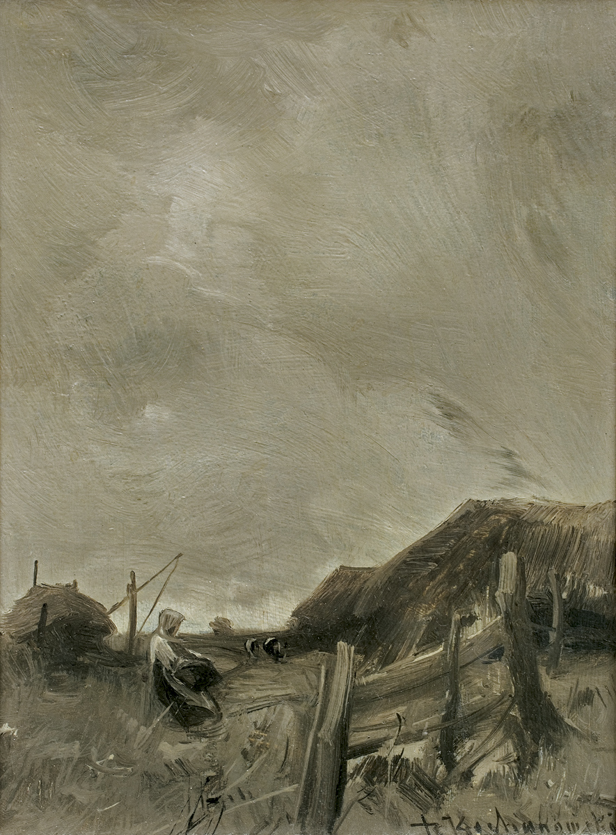 Roman Kochanowski (Kraków 1857 - Freising k. Monachium 1945) - malarz i grafik - był jednym z polskich artystów osiadłych i stałe działających w Monachium. Studia malarskie rozpoczął w Krakowie; początkowo w prywatnej pracowni Maksymiliana Cercha, a w latach 1873- 1875 w Szkole Sztuk Pięknych u Władysława Łuszczkiewicza i pejzażysty Henryka Grabińskiego. Przez następne dwa lata uczył się jeszcze na wydziale pejzażu w Akademii wiedeńskiej. W 1881 przeniósł się do Monachium, gdzie miał własną pracownię, a niebawem założył rodzinę. Często jednak przyjeżdżał do Krakowa, bywał w Poznańskiem, odbył podróż po Galicji i Podolu, rysując krajobrazy i widoki miast, które weszły następnie do albumu wydanego w Wiedniu w roku 1898. Artysta należał do monachijskiego Kunstvereinu, brał udział w wielu wystawach w Niemczech, w Wiedniu, w Londynie; swoje prace przesyłał też na pokazy krajowe. Malował przede wszystkim pejzaże a tylko z rzadka kwiaty i portrety. Stałym i ulubionym motywem jego obrazów był polski, podkrakowski krajobraz z wplecionymi weń postaciami ludzi. Obrazy artysty, malowane często na niewielkich deseczkach, pozbawione warstwy anegdotycznej odznaczają się niecodziennymi walorami malarskimi, harmonią koloru i pełnym liryzmu nastrojem. Zauważane i nagradzane na licznych wystawach były też wysoko cenione na rynku sztuki. W roku 1892, po wystawie w Wiedniu, jeden z obrazów Kochanowskiego zakupił do swoich zbiorów cesarz Franciszek Józef; dwa inne nabyli członkowie cesarskiej rodziny. Wielbicielem jego malarstwa był Karol Józef Luitpold, książę regent Bawarii. Wielka wrażliwość artysty na krajobraz i przyrodę widoczna jest także w jego rysunkach i akwafortach.