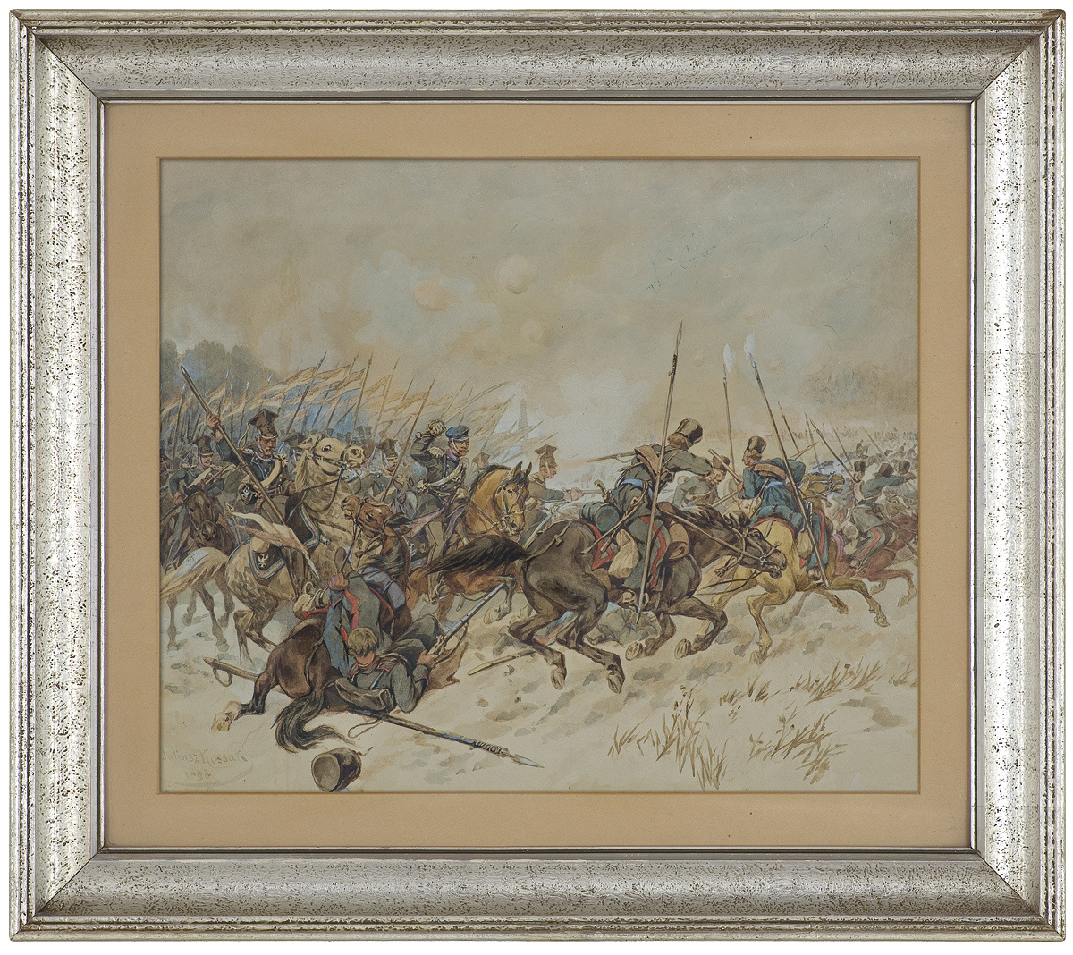 Juliusz Kossak (Wiśnicz 1824 - Kraków 1899) - malarz i ilustrator - był jednym z najpopularniejszych artystów polskich 2. połowy XIX wieku. Naukę rysunku i malarstwa rozpoczął we lwowskiej pracowni Jana Maszkowskiego; później wiele rysował z natury odwiedzając majątki szlacheckie na Ukrainie, Podolu i Wołyniu. W roku 1852 był w Wiedniu, na Węgrzech i w Petersburgu, a następnie zamieszkał na stałe w Warszawie. Lata 1856-1860 spędził w Paryżu, gdzie przyjaźnił się z Horacem Vernetem. Powróciwszy do Warszawy w latach 1862-1868 był kierownikiem artystycznym „Tygodnika Ilustrowanego”. W roku 1869 przeniósł się na stałe do Krakowa, skąd wyjeżdżał jeszcze do Monachium, by malować w atelier batalisty Franza Adama. Kossak był przede wszystkim znakomitym akwarelistą; rzadziej posługiwał się techniką olejną. Malował obrazy historyczne i batalistyczne, sceny rodzajowe ilustrujące życie i tradycje dworu szlacheckiego oraz obyczaje polskiego ludu. Ale prawdziwymi bohaterami jego obrazów były konie, których ruch, temperament, charakter i indywidualność potrafił po mistrzowsku przedstawić. Był także autorem wielu ilustracji do czasopism i książek, trafiającym bezbłędnie tak w klimat utworów literackich, jak i w tęsknoty i potrzeby odbiorców - czytelników Pieśni o ziemi naszej Wincentego Pola, Trylogii Henryka Sienkiewicza, Pana Tadeusza i poematów Adama Mickiewicza.