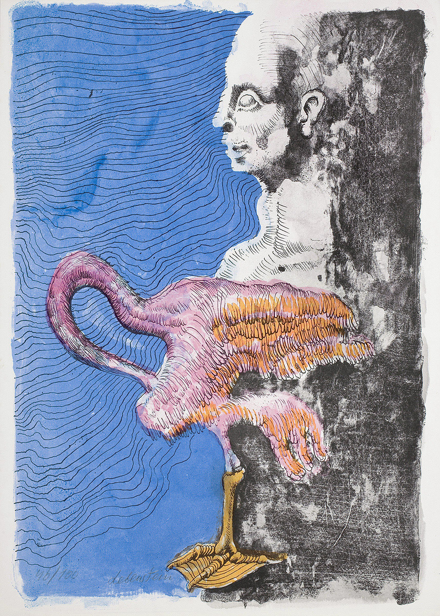 Jan Lebenstein (Brześć Litewski 1930 - Kraków 1999) w latach 1948-1954 studiował malarstwo w ASP w Warszawie pod kierunkiem prof. Eugeniusza Eibischa i Artura Nachta-Samborskiego. W 1955 wziął udział w wystawie w warszawskim Arsenale. Zaprzyjaźniony w czasie studiów z Mironem Białoszewskim, swą pierwszą wystawę indywidualną pokazał w 1956 w Teatrze na Tarczyńskiej. W 1959 zdobył Grand Prix de la Ville de Paris na I Biennale Młodych w Paryżu i w tym roku przeniósł się na stałe do Paryża. Po seriach "figur kreślonych" (na papierze milimetrowym) i "figur hieratycznych" z lat 1955-1958 maluje cykl "figur osiowych" (1958-1962), które wystawia w Paryżu i USA. Równolegle w 1960 zaczyna rysowane "karnety", rodzaj dziennika, który w przyszłości dostarczy motywów wykorzystanych w obrazach. W latach 1964-1965 maluje "Bestiarium", cykl fakturowych, archaizowanych stworów przypominających prehistoryczne wykopaliska. Bezpośrednio po nich wprowadza do swych obrazów postaci ludzkie i fantastyczne, odgrywające sceny ni to mitologiczne, ni to ze snu, często przesycone erotyką. W 1970 projektuje witraże dla Centre du Dialogue w Paryżu. W W 1971 otrzymuje obywatelstwo francuskie 1974 powstają gwasze inspirowane Folwarkiem zwierzęcym George'a Orwella. W latach 1976-1989 tworzy wyłącznie w technice gwaszu i pastelu, podejmując tematykę mitologiczną i zaczerpniętą z Biblii: cykle ilustracji do Księgi Hioba (wyd. 1979) i do Apokalipsy (wyd. 1986) w nowych przekładach Czesława Miłosza. W 1989 powraca do malarstwa olejnego (cykl "Pergamon"). Artysta otrzymał m. in. nagrodę Fundacji im. Alfreda Jurzykowskiego w 1976, Nagrodę Muzeum Archidiecezji Warszawskiej w 1985, Nagrodę im. Jana Cybisa w 1987.