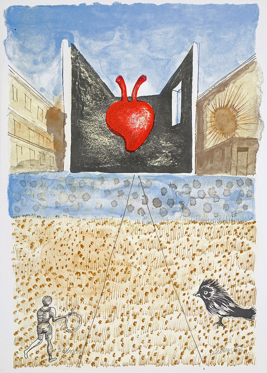 Jan Lebenstein (Brześć Litewski 1930 - Kraków 1999) w latach 1948-1954 studiował malarstwo w ASP w Warszawie pod kierunkiem prof. Eugeniusza Eibischa i Artura Nachta-Samborskiego. W 1955 wziął udział w wystawie w warszawskim Arsenale. Zaprzyjaźniony w czasie studiów z Mironem Białoszewskim, swą pierwszą wystawę indywidualną pokazał w 1956 w Teatrze na Tarczyńskiej. W 1959 zdobył Grand Prix de la Ville de Paris na I Biennale Młodych w Paryżu i w tym roku przeniósł się na stałe do Paryża. Po seriach "figur kreślonych" (na papierze milimetrowym) i "figur hieratycznych" z lat 1955-1958 maluje cykl "figur osiowych" (1958-1962), które wystawia w Paryżu i USA. Równolegle w 1960 zaczyna rysowane "karnety", rodzaj dziennika, który w przyszłości dostarczy motywów wykorzystanych w obrazach. W latach 1964-1965 maluje "Bestiarium", cykl fakturowych, archaizowanych stworów przypominających prehistoryczne wykopaliska. Bezpośrednio po nich wprowadza do swych obrazów postaci ludzkie i fantastyczne, odgrywające sceny ni to mitologiczne, ni to ze snu, często przesycone erotyką. W 1970 projektuje witraże dla Centre du Dialogue w Paryżu. W W 1971 otrzymuje obywatelstwo francuskie 1974 powstają gwasze inspirowane Folwarkiem zwierzęcym George'a Orwella. W latach 1976-1989 tworzy wyłącznie w technice gwaszu i pastelu, podejmując tematykę mitologiczną i zaczerpniętą z Biblii: cykle ilustracji do Księgi Hioba (wyd. 1979) i do Apokalipsy (wyd. 1986) w nowych przekładach Czesława Miłosza. W 1989 powraca do malarstwa olejnego (cykl "Pergamon"). Artysta otrzymał m. in. nagrodę Fundacji im. Alfreda Jurzykowskiego w 1976, Nagrodę Muzeum Archidiecezji Warszawskiej w 1985, Nagrodę im. Jana Cybisa w 1987.