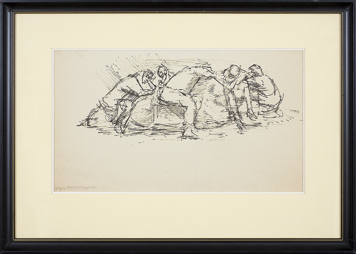 Adam Marczyński (Kraków 1908 – Kraków 1985) studiował malarstwo w ASP w Krakowie w latach 1930-1936 pod kierunkiem prof. Władysława Jarockiego i Stanisława Pieńkowskiego. Dyplom otrzymał w 1936. W czasie studiów odbył podróż do Francji i Hiszpanii (1930), po ich ukończeniu - do Francji (1936). W latach 1933-1934 był związany z „Grupą Krakowską“ (tzw. pierwszą), z którą dwukrotnie wystawiał. Wykonywał też scenografie dla teatru „Cricot“. Pierwsze lata II wojny światowej spędził we Lwowie. Wrócił do Krakowa w 1941. Po wojnie podjął pracę pedagogiczną w ASP (od 1945, profesor 1951, dziekan Wydziału Malarstwa 1970-1972, emerytowany w 1979). Jednocześnie na powrót stowarzyszył się z kręgiem artystów skupionych wokół Tadeusza Kantora i Marii Jaremy, którzy w 1957 powołali tzw. drugą „Grupę Krakowską“. Marczyński pozostawał jej członkiem i wystawiał z nią do końca życia. Zajmował się malarstwem, rysunkiem, scenografią, grafiką warsztatową i ilustracją książkową. Wykonywał też polichromie w kościołach. W latach 50. tworzył kubizujące kompozycje malarskie o jasnym kolorycie, sugerujące ni to pejzaże, ni to widoki podwodnych światów, odznaczające się poetyckim, surrealnym nastrojem, przywołującym na myśl sztukę Paula Klee i Joana Miró. Z wyrazem prac malarskich współgrały jego ówczesne rysunki, kreślone delikatną kreską. Od ok. 1960 wykonywał cykl obiektów pt. Konkrety, nawiązujących do malarstwa materii, w których wykorzystywał jako tworzywo płaty drewnianej sklejki lub forniru, papę, rzadziej blachę, poddawane dodatkowo różnym zabiegom, jak nadpalanie, niszczenie powierzchni itp. Od połowy lat 60. tworzył obiekty o elementach zmiennych - budowane z zestawianych dowolnie „pudełek“ o uchylnych wieczkach. Różne konfiguracje ich nachylenia powodowały zmienne rytmy całości kompozycji. Artysta wiele wystawiał, m.in. na Wystawie Olimpijskiej, Londyn 1948 (wyróżnienie i dyplom), Biennale Sztuki w Wenecji w 1956, II i III Wystawie Sztuki Nowoczesnej, Warszawa 1957 i 1959, II Międzynarodowym Biennale Grafiki, Lublana 1957 (nagroda honorowa), Biennale Sztuki w Sao Paulo 1959 i Documenta w Kassel 1959, Sympozjach „Złotego Grona“, Zielona Góra 1963 i 1965, I Biennale Form Przestrzennych, Elbląg 1965.