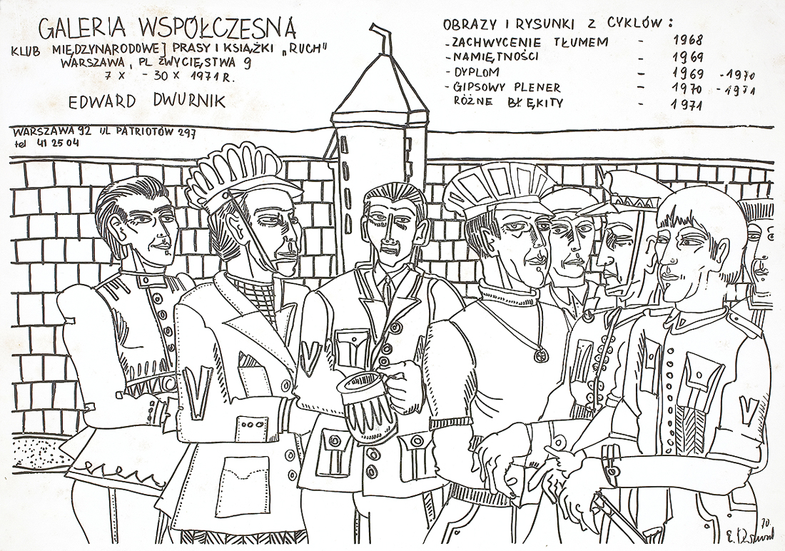Edward Dwurnik (Radzymin 19 IV 1943 - Warszawa 28 X 2018) studiował malarstwo w ASP w Warszawie (1963-1970), jednak jako swego „mistrza“ wymienia Nikifora. Jego to prace, zobaczone po raz pierwszy w 1965, zainspirowały ówczesnego studenta III roku do narysowania pierwszych prac z cyklu „Podróże autostopem“, które kontynuował w nastepnych latach. W 1972-1978 powstawał cykl „Sportowcy“, w którym portretowane były, dodajmy - kąśliwie, typowe postaci z lat 70. Równolegle od 1975 powstawał cykl „Robotnicy“, który kulminował w okresie „Solidarności“ 1980-1981. Za prace z tego cyklu Dwurnik otrzymał w 1981 Nagrodę Krytyki Artystycznej im. Cypriana Kamila Norwida, natomiast za obrazy z cyklu „Warszawa“ (1981), proroczo zapowiadające stan wojenny - Nagrodę Kulturalną „Solidarności“ podziemnej w 1983. W latach 80. malarstwo Dwurnika przybrało wyraz ekspresyjny i dramatyczny. Powstające w tej dekadzie obrazy miały niejednokrotnie wymowę polityczną, przybierały też kostium historyczny, tak czy inaczej odnoszący się do współczesnych spraw i realiów. Cykl „Droga na Wschód“ (1989-91) upamiętniał ofiary stalinizmu, natomiast cykl „Od Grudnia do Czerwca“ (1990-94) - ofiary stanu wojennego. Zarówno ideowe, jak i czysto malarskie walory tych prac przyniosły artyście ogromne uznanie, zarówno w kraju jak i za granicą. Jego wyrazem była prestiżowa nagroda Fundacji Coutts & Co w Zurychu (1992). W latach 90. powstają cykle będące kontynuacją „Podróży autostopem“: „Niebieskie miasta“ (od 1993) i „Diagonale“ (od 1996), jak również kompozycje nowego typu, jak widoki morskie (cykl „Błękitne“, 1992-93) czy cykl „Wyliczanka“ (1996-99). Artysta wiele wystawia, miał ok. 100 wystaw indywidualnych w Polsce i za granicą, brał też udział w licznych wystawach i festiwalach krajowych i międzynarodowych, m.in.: X Biennale Sztuki Współczesnej, Menton 1974, Documenta 7, Kassel 1982, 5th Biennale, Sydney 1985, XIX Biennale Sztuki, Sao Paulo 1987; Olimpiada Sztuki, Seul 1988. Równolegle z malarstwem uprawiał rysunek, collage, grafikę warsztatową (litografia, techniki metalowe, kserografia, stemple) i użytkową (ilustracja, plakaty do własnych wystaw indywidualnych).
