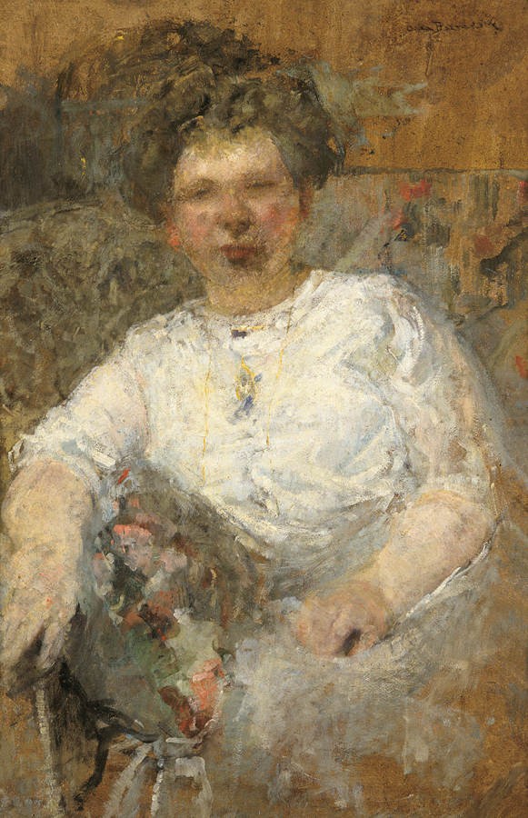 Olga Boznańska (Kraków 1865 - Paryż 1940) – wybitna malarka polska – kształciła się w Krakowie, początkowo pod kierunkiem matki, nauczycielki rysunków Eugenii Mondan, później u J. Siedleckiego, H. Lipińskiego, K. Pochwalskiego. W latach 1884-1886 uczęszczała także na Wyższe Kursy Artystyczne dla Kobiet przy Muzeum Techniczno-Przemysłowym. W 1886 wyjechała do Monachium gdzie uczyła się pod kierunkiem Karla Kricherdorfa i Wilhelma Dürra. Od 1889 pracowała samodzielnie i miała w Monachium własną pracownię. Od 1895 nauczała w prywatnej szkole malarstwa Theodora Humla. Z Monachium wielokrotnie jeździła do kraju, a także do Francji i Szwajcarii. W 1898 przeniosła się na stałe do Paryża, gdzie – przez lata – była jedną z czołowych postaci polskiej kolonii artystycznej. Debiutowała w roku 1886 na wystawie w krakowskim Towarzystwie Przyjaciół Sztuk Pięknych i odtąd stale uczestniczyła w wystawach krajowych i zagranicznych, zdobywając medale i wyróżnienia. W roku 1910 otrzymała francuską Legię Honorową, w roku 1938 order Polonia Restituta. Należała do wielu znaczących – polskich i europejskich – stowarzyszeń artystycznych. Główną domeną jej twórczości był portret – we wcześniejszym, monachijskim okresie często cało postaciowy, monumentalny i zwarty w formie; w czasach paryskich bardziej kameralny, nastrojowy, o zróżnicowanych walorowo plamach barwnych podporządkowanych dominacji jednego tonu, gubiących kontury i zacierających ostrość planów. Malowała też martwe natury i – rzadziej – pejzaże miejskie czy kompozycje rodzajowe.