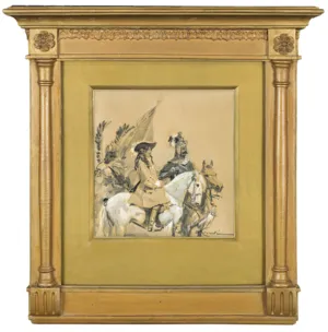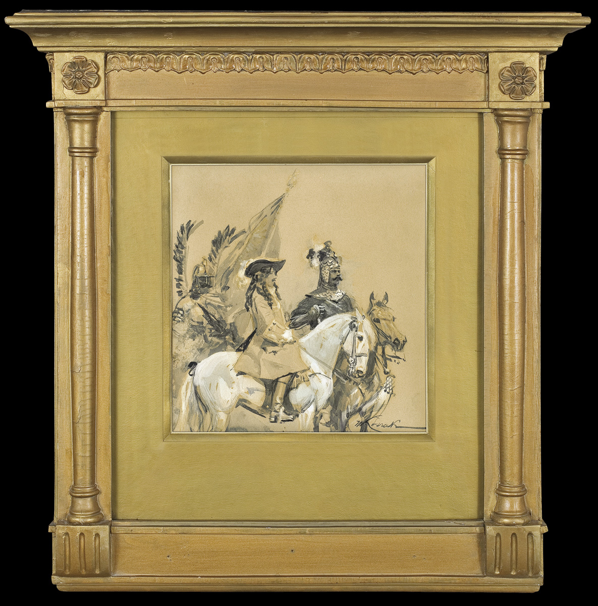 Rysunek jest jednym z kilku „reporterskich“ szkiców, wykonanych przez Wojciecha Kossaka bezpośrednio po wspaniałej defiladzie urządzonej w Wiedniu 12 VI 1908 z okazji 60 rocznicy wstąpienia na tron cesarza Franciszka Józefa. Uroczysty pochód przesuwający się przed trybuną cesarza był główną atrakcją tych uroczystości. Jego uczestnicy zgrupowani byli w dwóch grupach: - historycznej, przedstawiającej dzieje Austrii aż do chwili gdy cesarz wstąpił na tron oraz „etnograficznej“, wyrażającej hołd ludów całego austriackiego cesarstwa. Kossak uczestniczył w przygotowaniach tej parady, sam też wystąpił jako Jana III jadący w towarzystwie cesarza Leopolda, którego odegrał baron Weckbecker.