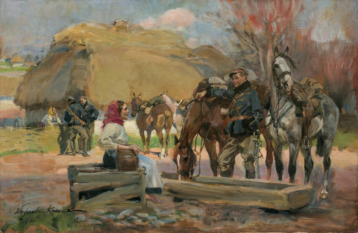 Wojciech Kossak (Paryż 1856 - Kraków 1942 ) – powszechnie znany malarz, postrzegany przede wszystkim jako świetny batalista. Syn i uczeń Juliusza Kossaka kształcił się w krakowskiej Szkole Sztuk Pięknych, w Akademii monachijskiej oraz w Paryżu. W latach 1895-1902 przebywał głównie w Berlinie, pracując dla cesarza Wilhelma II. Wiele podróżował, m.in. do Hiszpanii i Egiptu, gdzie wykonywał szkice do zamierzonych panoram. W późniejszych latach kilkakrotnie wyjeżdżał do Stanów Zjednoczonych wykonując zamówienia portretowe. W 1913 był mianowany profesorem warszawskiej Szkoły Sztuk Pięknych. W latach I wojny światowej pełnił służbę wojskową. Był współautorem panoram: „Racławice” (1893-1894), „Berezyna” (1895-1896), „Bitwa pod piramidami” (1901) oraz szkiców do niezrealizowanej „Somosierry” (1900). Z temperamentem i swobodą tworzył szeroko malowane, dynamiczne sceny batalistyczne, historyczne, rodzajowe oraz liczne portrety. Z upodobaniem malował konie. Jego obrazy, gloryfikujące dawne i współczesne artyście polskie wojsko i bohaterstwo żołnierzy, trafiały do patriotycznych uczuć odbiorców i cieszyły się ogromna popularnością.