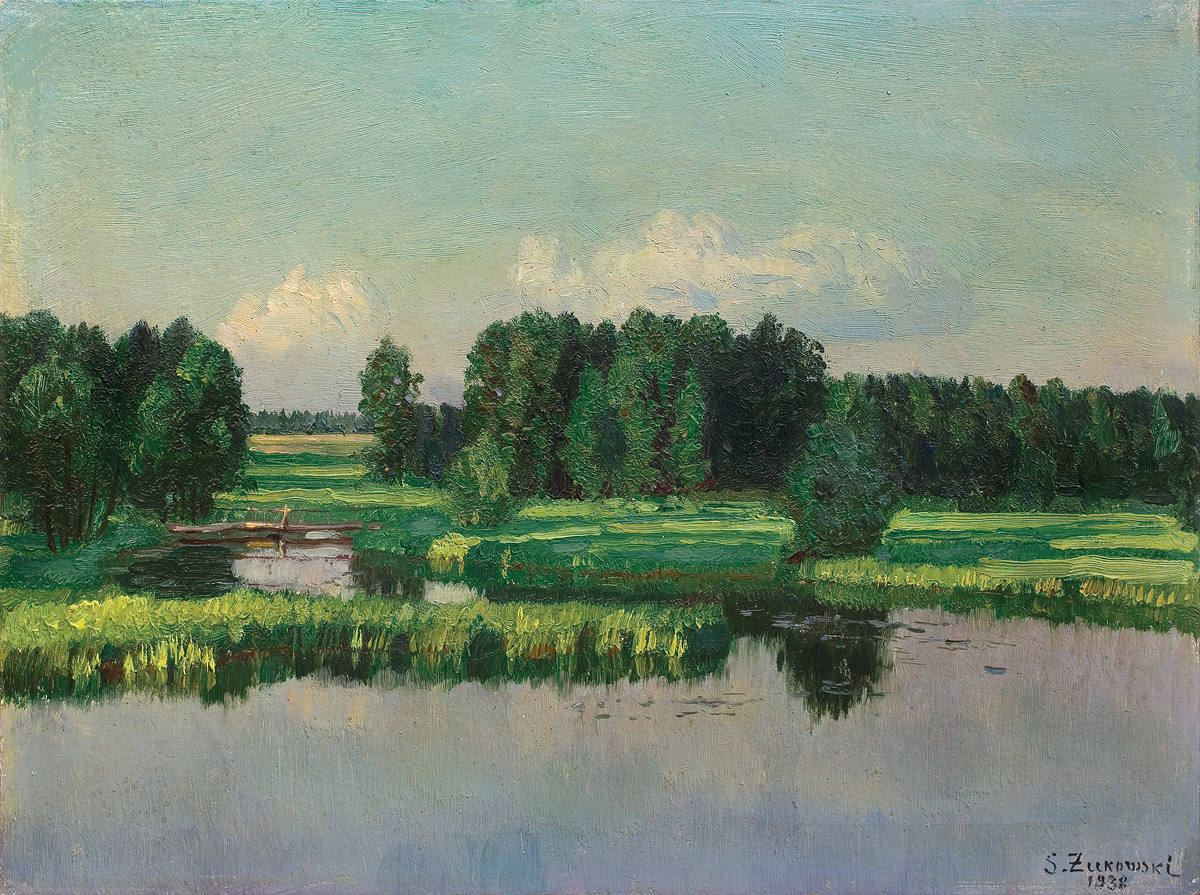 Stanisław Żukowski (Jędrychowice k. Grodna 1875 - Pruszków 1944) – malarz pejzażysta; w latach 1892-1901 studiował w Moskiewskiej Szkole Malarstwa, Rzeźby i Architektury, m.in u Siergieja Korowina, Abrama Archipowa i Isaaka Lewitana. Po studiach pozostał w Rosji. Od 1896 uczestniczył w wystawach Towarzystwa Pieriedwiżników; w roku 1907 otrzymał tytuł akademika. Od 1923 stale mieszkał w Warszawie, gdzie wielokrotnie wystawiał w Towarzystwie Zachęty Sztuk Pięknych. Był przede wszystkim znakomitym pejzażystą; malował także wnętrza i rzadziej portrety. Jego obrazy, zawsze wysoko cenione, niejednokrotnie były odznaczane medalami na wystawach - m.in. w roku 1912 na międzynarodowej wystawie w Monachium nagrodzono złotym medalem Jesienny wieczór. Podczas pobytu w Rosji, artysta najczęściej podpisywał swoje prace cyrylicą, później alfabetem łacińskim. Wiele jego obrazów znajduje się w polskich zbiorach muzealnych oraz w muzeach Moskwy, Petersburga i Mińska. Katalog znanych dzieł artysty zawiera bogato ilustrowana monografia, autorstwa M.U.Goriełowa [Stanisław Julianowicz Żukowskij, Moskwa 1982].
