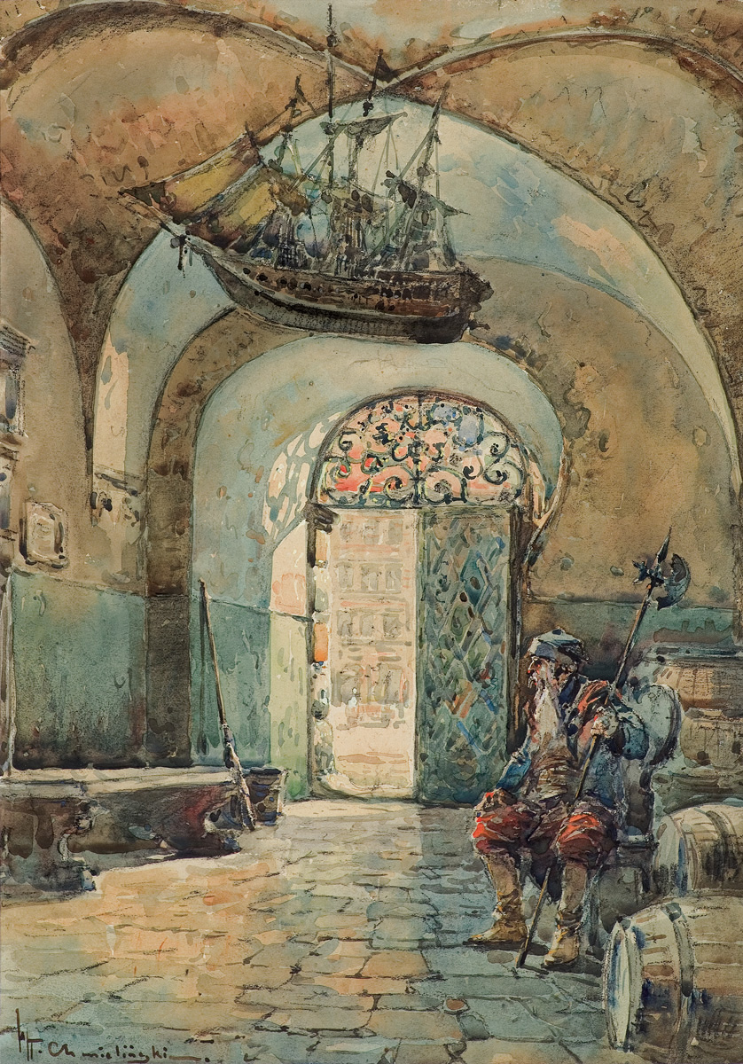Władysław Chmieliński (Warszawa 1911 - Warszawa 1979) był malarzem związanym z Warszawą, gdzie stale mieszkał i pracował. W latach 1926-1931 studiował w warszawskiej Miejskiej Szkole Sztuk Zdobniczych i Malarstwa (dawna Klasa Rysunkowa). Wiodącym tematem jego obrazów były widoki miejskie, malowane olejno i akwarelą. W latach 1935-1938 stworzył cykl akwarel przedstawiających obiekty polskiej architektury; wśród nich, widoki Sandomierza, Krakowa, Kazimierza nad Wisłą, a także wnętrza zabytkowych kościołów czy pałaców, m.in. Zamku Królewskiego w Warszawie i Pałacu w Wilanowie. Malował także pejzaże i wiejskie sceny rodzajowe – kuligi, sanny, zaprzęgi, wesela, konie na tle krajobrazu. W latach 1967-1969 wyjeżdżał na dłuższe pobyty do Danii. W latach 1936-1939 artysta używał także pseudonimu „Władysław Stachowicz”.