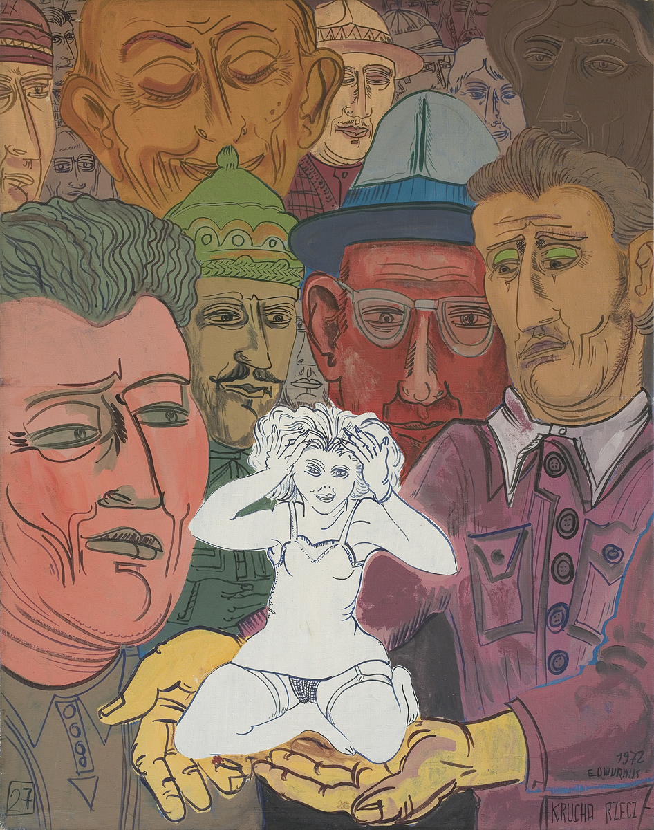 Edward Dwurnik (Radzymin 19 IV 1943 - Warszawa 28 X 2018) studiował malarstwo w ASP w Warszawie (1963-1970), jednak jako swego „mistrza“ wymienia Nikifora. Jego to prace, zobaczone po raz pierwszy w 1965, zainspirowały ówczesnego studenta III roku do narysowania pierwszych prac z cyklu „Podróże autostopem“, które kontynuował w nastepnych latach. W 1972-1978 powstawał cykl „Sportowcy“, w którym portretowane były, dodajmy - kąśliwie, typowe postaci z lat 70. Równolegle od 1975 powstawał cykl „Robotnicy“, który kulminował w okresie „Solidarności“ 1980-1981. Za prace z tego cyklu Dwurnik otrzymał w 1981 Nagrodę Krytyki Artystycznej im. Cypriana Kamila Norwida, natomiast za obrazy z cyklu „Warszawa“ (1981), proroczo zapowiadające stan wojenny - Nagrodę Kulturalną „Solidarności“ podziemnej w 1983. W latach 80. malarstwo Dwurnika przybrało wyraz ekspresyjny i dramatyczny. Powstające w tej dekadzie obrazy miały niejednokrotnie wymowę polityczną, przybierały też kostium historyczny, tak czy inaczej odnoszący się do współczesnych spraw i realiów. Cykl „Droga na Wschód“ (1989-91) upamiętniał ofiary stalinizmu, natomiast cykl „Od Grudnia do Czerwca“ (1990-94) - ofiary stanu wojennego. Zarówno ideowe, jak i czysto malarskie walory tych prac przyniosły artyście ogromne uznanie, zarówno w kraju jak i za granicą. Jego wyrazem była prestiżowa nagroda Fundacji Coutts & Co w Zurychu (1992). W latach 90. powstają cykle będące kontynuacją „Podróży autostopem“: „Niebieskie miasta“ (od 1993) i „Diagonale“ (od 1996), jak również kompozycje nowego typu, jak widoki morskie (cykl „Błękitne“, 1992-93) czy cykl „Wyliczanka“ (1996-99). Artysta wiele wystawia, miał ok. 100 wystaw indywidualnych w Polsce i za granicą, brał też udział w licznych wystawach i festiwalach krajowych i międzynarodowych, m.in.: X Biennale Sztuki Współczesnej, Menton 1974, Documenta 7, Kassel 1982, 5th Biennale, Sydney 1985, XIX Biennale Sztuki, Sao Paulo 1987; Olimpiada Sztuki, Seul 1988. Równolegle z malarstwem uprawiał rysunek, collage, grafikę warsztatową (litografia, techniki metalowe, kserografia, stemple) i użytkową (ilustracja, plakaty do własnych wystaw indywidualnych).
