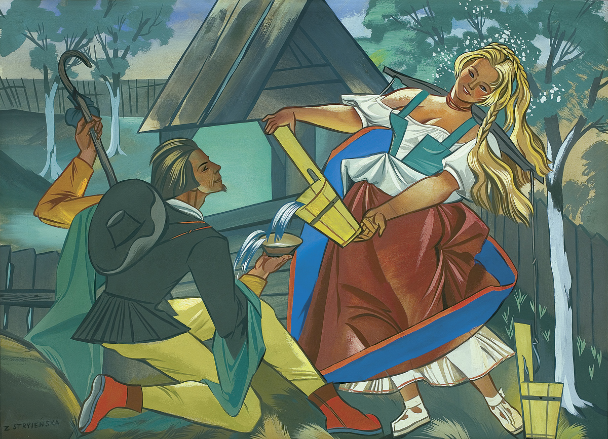 Zofia Stryjeńska, z domu Lubańska (Kraków 1891 - Genewa 1976) - malarka, ilustratorka, scenograf - była jedną z barwniejszych postaci polskiego środowiska artystycznego w dwudziestoleciu międzywojennym. Po krótkim okresie nauki u Leonarda Stroynowskiego i w krakowskiej szkole Marii Niedzielskiej wyjechała do Monachium, gdzie w latach 1911-1912 w męskim przebraniu studiowała w Akademii Sztuk Pięknych (kobiet wówczas na studia nie przyjmowano). Debiutowała w krakowskim TPSP w roku 1912 cyklem kartonów Polskich bajd inspirowanych opowieściami ludowymi. W 1916 wyszła za mąż za Karola Stryjeńskiego. Do 1919 mieszkała w Krakowie, później w Paryżu, Krakowie, Zakopanem i Warszawie. W roku 1925 odniosła międzynarodowy sukces na Wystawie Sztuki Dekoracyjnej w Paryżu, otrzymując Gran Prix w czterech działach (malarstwo, plakat, tkanina, ilustracja) oraz Diplom d’Honneur za projekty zabawek. Zajmowała się dekoracyjnym malarstwem architektonicznym, polichromią, ilustratorstwem, scenografią (m.in. Harnasie Karola Szymanowskiego; 1938), wzornictwem przemysłowym (projekty kilimów, zabawek). Stworzyła własny specyficzny styl w dekoracyjnie stylizowanych, barwnych, pełnych dynamiki i temperamentu obrazach; temperach, akwarelach i gwaszach. W ich tematyce odwoływała się do legend, wierzeń, historii i obyczajowości ludowej. Wydała kilka tek graficznych (Bożki słowiańskie, 1917 i 1922) i albumów reprodukcji (Tańce polskie, 1927; Pascha, 1929; Piastowie, 1929; Gusła Słowian / Magie Slave, 1934). Jej prace popularyzowane były także przez liczne barwne pocztówki.