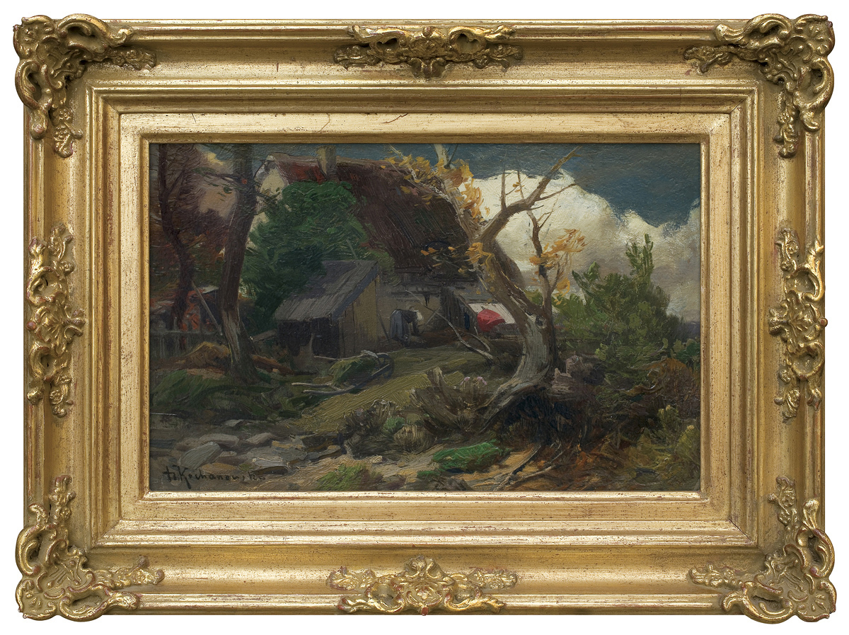 Roman Kochanowski (Kraków 1857 - Freising k. Monachium 1945) - malarz i grafik - był jednym z polskich artystów osiadłych i stałe działających w Monachium. Studia malarskie rozpoczął w Krakowie; początkowo w prywatnej pracowni Maksymiliana Cercha, a w latach 1873- 1875 w Szkole Sztuk Pięknych u Władysława Łuszczkiewicza i pejzażysty Henryka Grabińskiego. Przez następne dwa lata uczył się jeszcze na wydziale pejzażu w Akademii wiedeńskiej. W 1881 przeniósł się do Monachium, gdzie miał własną pracownię, a niebawem założył rodzinę. Często jednak przyjeżdżał do Krakowa, bywał w Poznańskiem, odbył podróż po Galicji i Podolu, rysując krajobrazy i widoki miast, które weszły następnie do albumu wydanego w Wiedniu w roku 1898. Artysta należał do monachijskiego Kunstvereinu, brał udział w wielu wystawach w Niemczech, w Wiedniu, w Londynie; swoje prace przesyłał też na pokazy krajowe. Malował przede wszystkim pejzaże a tylko z rzadka kwiaty i portrety. Stałym i ulubionym motywem jego obrazów był polski, podkrakowski krajobraz z wplecionymi weń postaciami ludzi. Obrazy artysty, malowane często na niewielkich deseczkach, pozbawione warstwy anegdotycznej odznaczają się niecodziennymi walorami malarskimi, harmonią koloru i pełnym liryzmu nastrojem. Zauważane i nagradzane na licznych wystawach były też wysoko cenione na rynku sztuki. W roku 1892, po wystawie w Wiedniu, jeden z obrazów Kochanowskiego zakupił do swoich zbiorów cesarz Franciszek Józef; dwa inne nabyli członkowie cesarskiej rodziny. Wielbicielem jego malarstwa był Karol Józef Luitpold, książę regent Bawarii. Wielka wrażliwość artysty na krajobraz i przyrodę widoczna jest także w jego rysunkach i akwafortach.