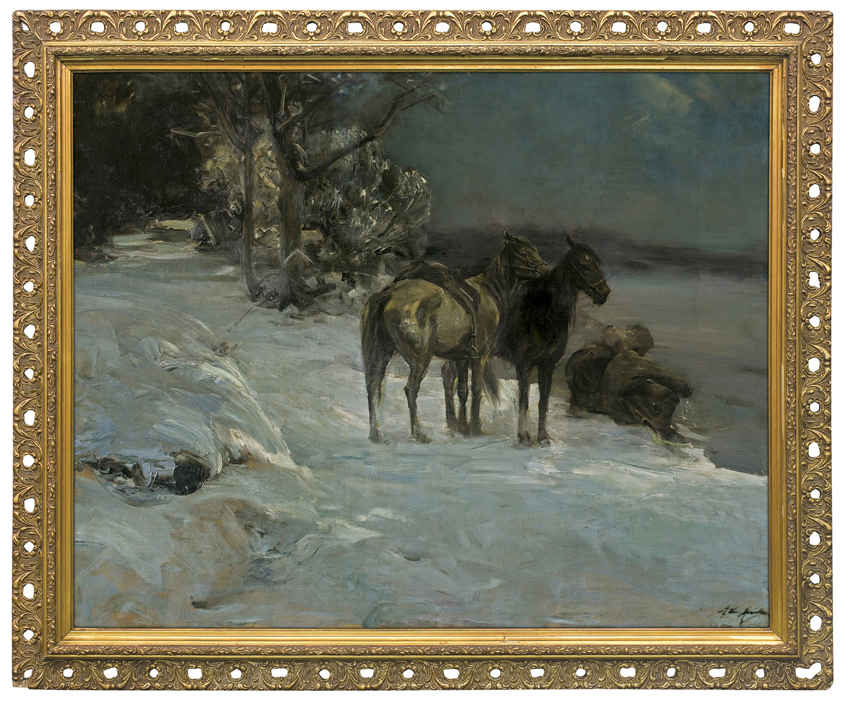 Alfred Wierusz-Kowalski (Suwałki 1849 – Monachium 1915) - jeden z najwybitniejszych polskich malarzy tzw. szkoły monachijskiej był, obok Józefa Brandta i Władysława Czachórskiego, także najpopularniejszym z polskich artystów osiadłych i stale działających w Monachium. Zamieszkał tam w roku 1873, już po studiach w Warszawie i w Dreźnie. Przez rok uczył się jeszcze w monachijskiej Akademii Sztuk Pięknych pod kierunkiem Alexandra Wagnera, a następnie przeniósł się do prywatnej pracowni Brandta. Uznanie krytyki i publiczności zdobył wcześnie; jego obrazy, odznaczane medalami na wystawach były rozchwytywane przez kolekcjonerów i niemieckich handlarzy. W roku 1890 został honorowym profesorem Akademii monachijskiej. Malował sceny rodzajowe i rodzajowo-historyczne z motywami jeźdźców, rycerzy, myśliwych, koni, wilków i śniegów. Po podróży do Afryki w roku 1903 podejmował też tematy orientalne. W polskich zbiorach muzealnych znalazło się stosunkowo niewiele prac artysty – jego obrazy sprzedawane głównie na rynku niemieckim w większej liczbie trafiały do kolekcji prywatnych, głównie w Niemczech i Stanach Zjednoczonych. Obecne często pojawiają się i na polskim rynku sztuki, zawsze budząc zainteresowanie kolekcjonerów.